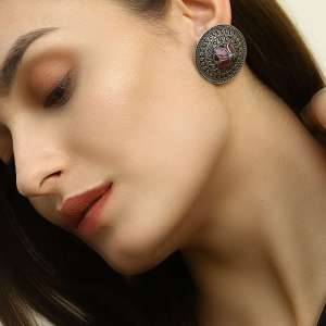 Women Round Shape Pink Stone Studded Oxidised Studs Our Silver Plating is non-allergic to Skin