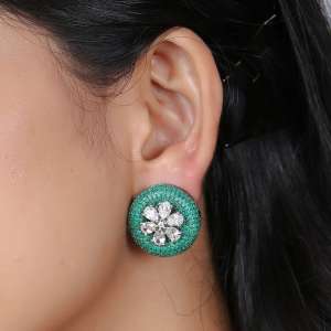 Women Flower Green Stone Studded Oxidised Stud Earrings, ,and has artificial stones,Secured with a fraction Back closure.