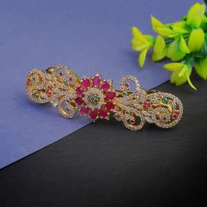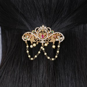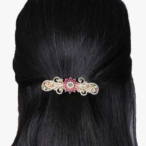 Women Gold-Plated Green and Red Stone Studded White Pearl Tessel Handcrafted Hair Clip. This Hair Clip have Buckle Pin Closure