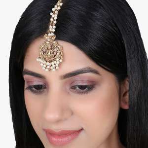 Women Gold-Plated Kundan Stone-Studded White Pearl Beaded Maangtikka, 24CT gold-plated Stone-Studded maang tikka centerpiece secured with a hook closure.