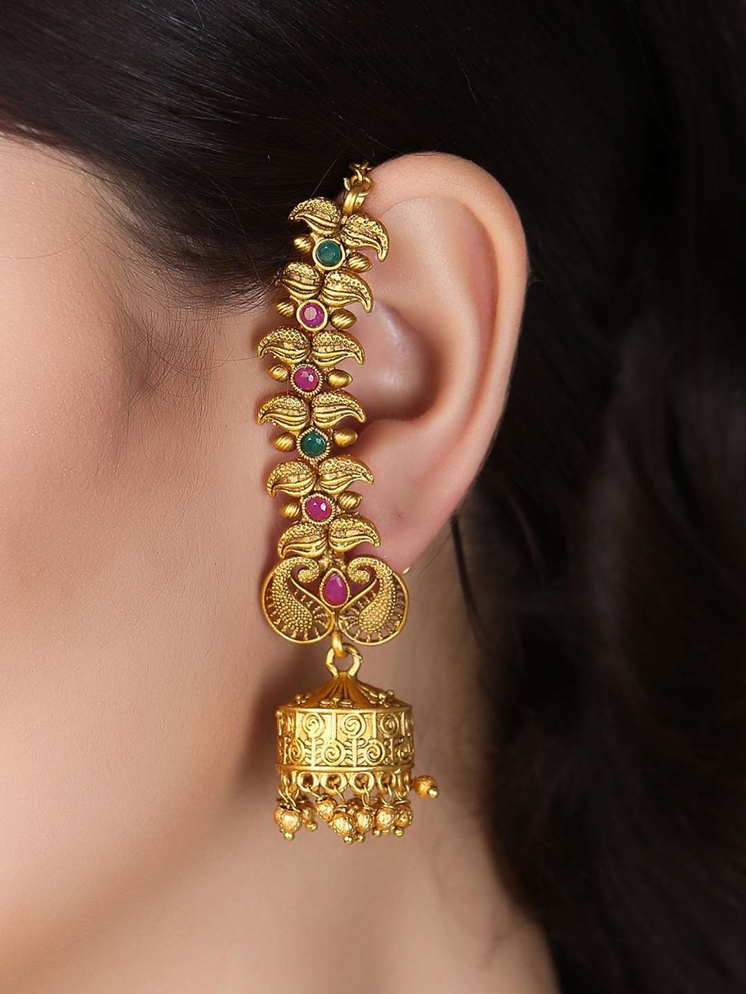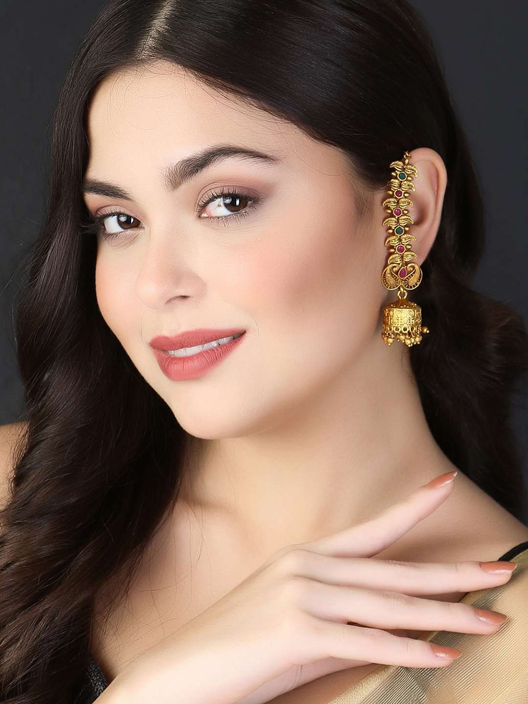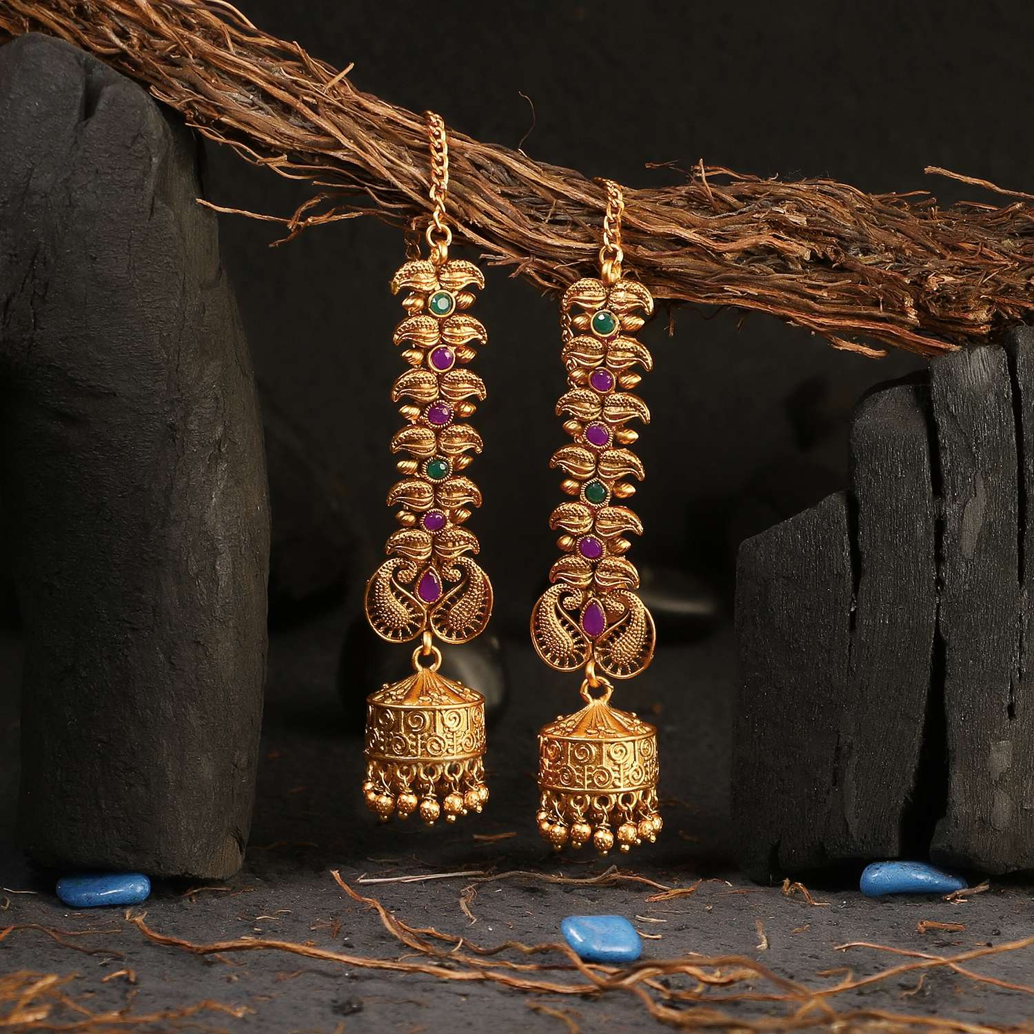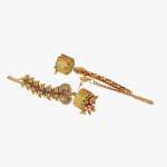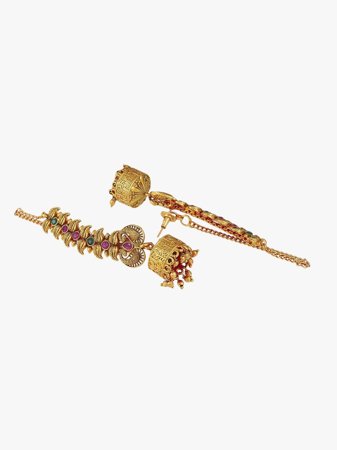 Women 24CT Gold-Plated Stone-Studded Gold-Pearl Tessel Leaf Temple Jhumka with Chain, An Elegent Handcrafted Design of Jhumka Earring ,Gold-Plated,our Gold plating is long lasting and non allergic to skin,and has artificial stones,Secured with a Post back closure.