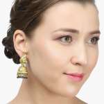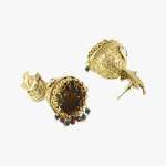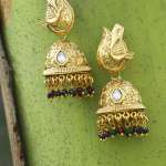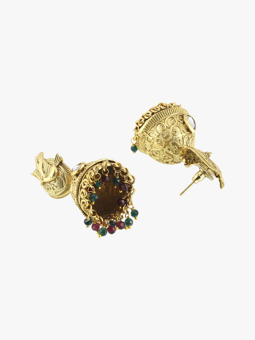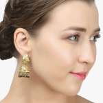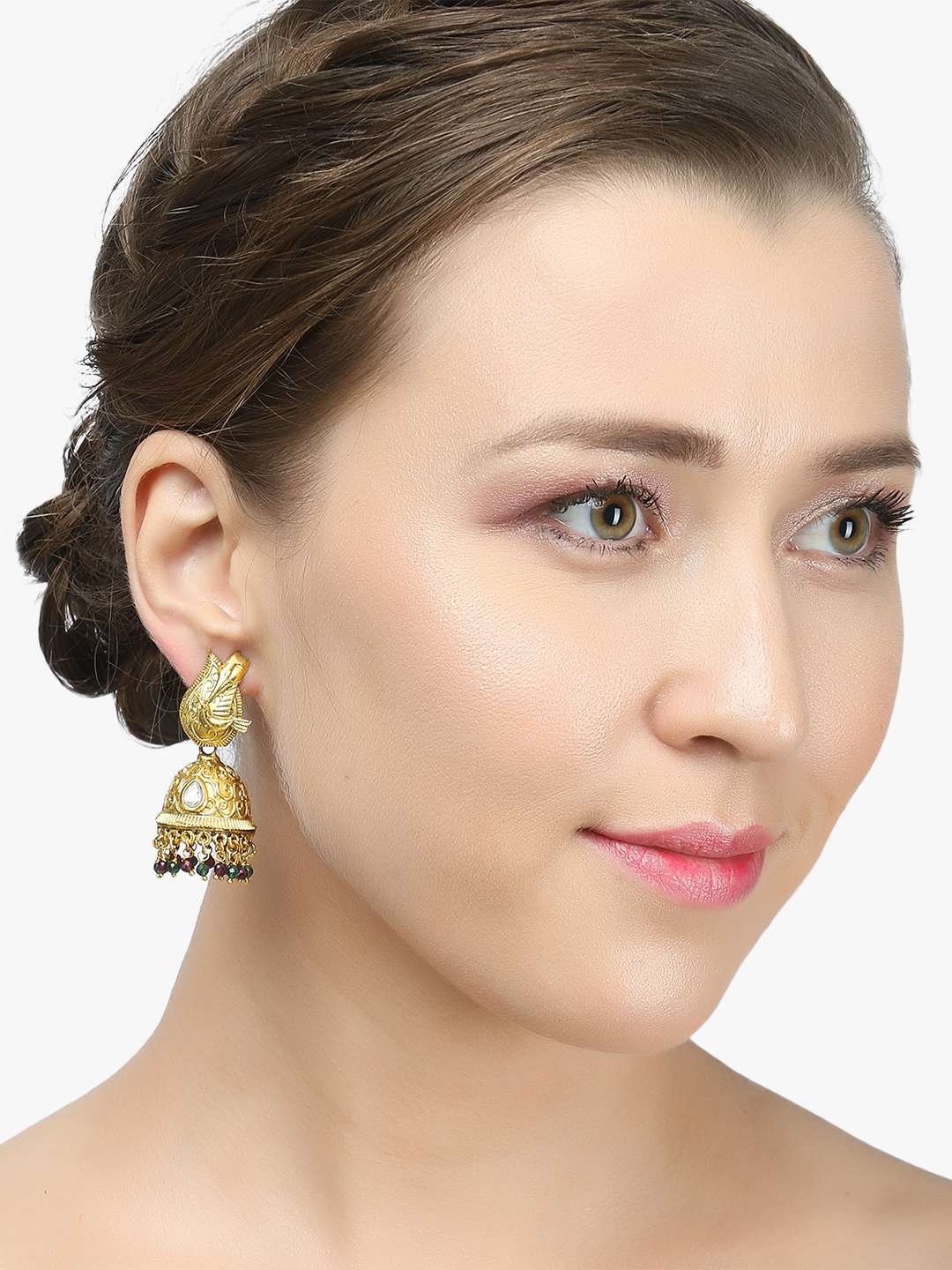 Women 24CT Gold-Plated stone studded Pecock-Shaped Jhumkas Pearl Copper Jhumki Earring,Gold-plated,our Gold plating is long lasting and non allergic to skin,and has artificial stones,Secured with a post and back closure.