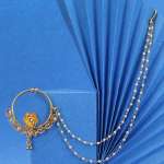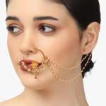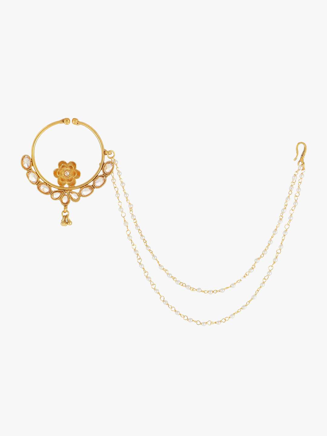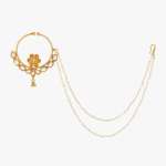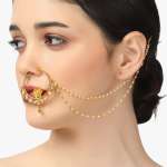 Gold-plated stone-studded beaded nose ring with pearl chain Secured with a clip-on closure,our Gold-plating is long lasting and non allergic to skin.