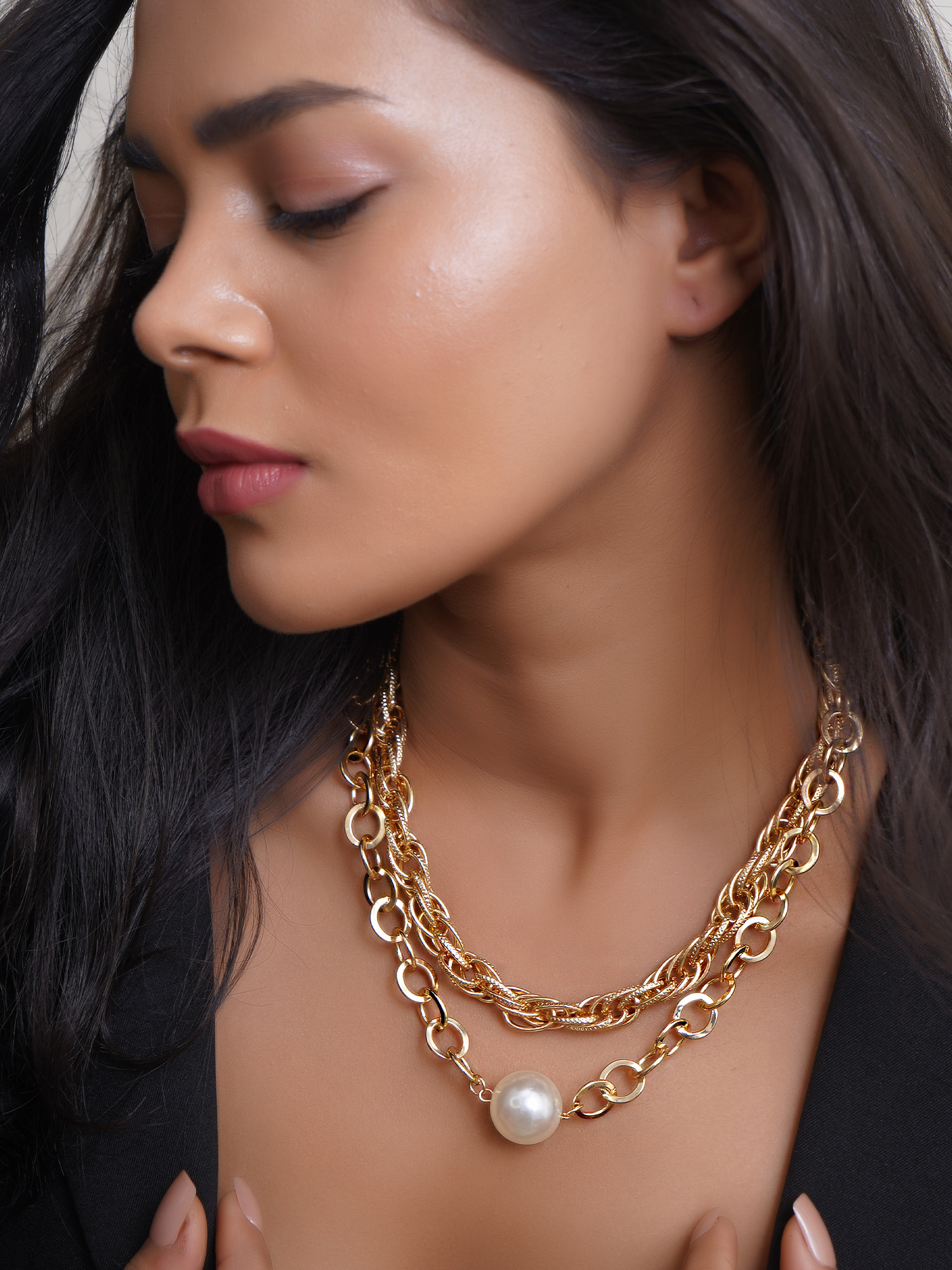 The 24CT Gold Plated Bold Look Layered Pearl Necklace is a statement piece designed to elevate your style with luxurious sophistication. Featuring multiple layers of lustrous pearls set against a radiant 24-carat gold plating, this necklace delivers a bold yet elegant appearance. Perfect for formal occasions, parties, or adding a touch of glamour to everyday wear, its durable and tarnish-resistant finish ensures long-lasting shine and beauty. Make a confident style statement with this timeless layered necklace