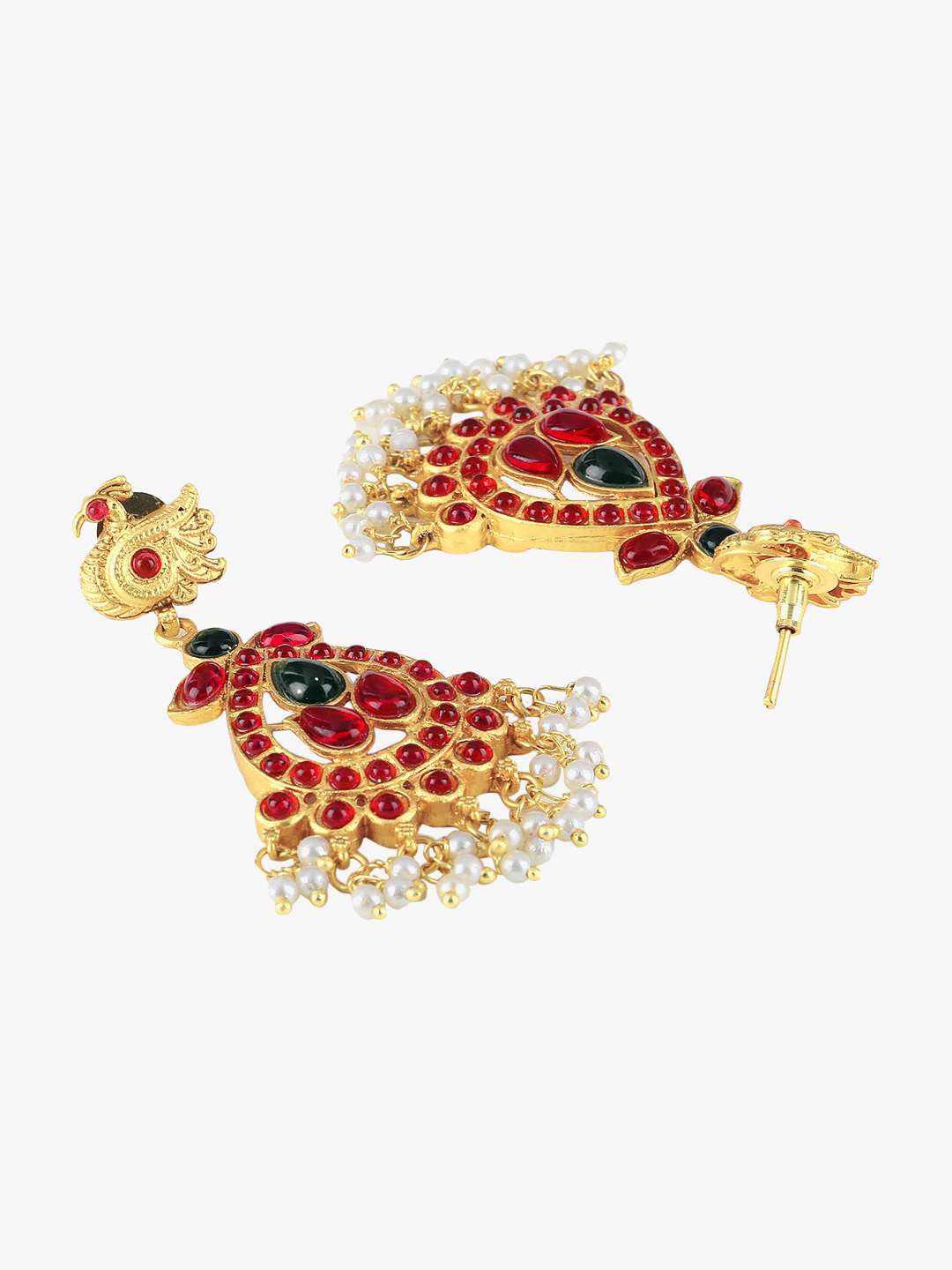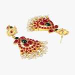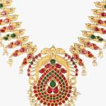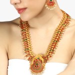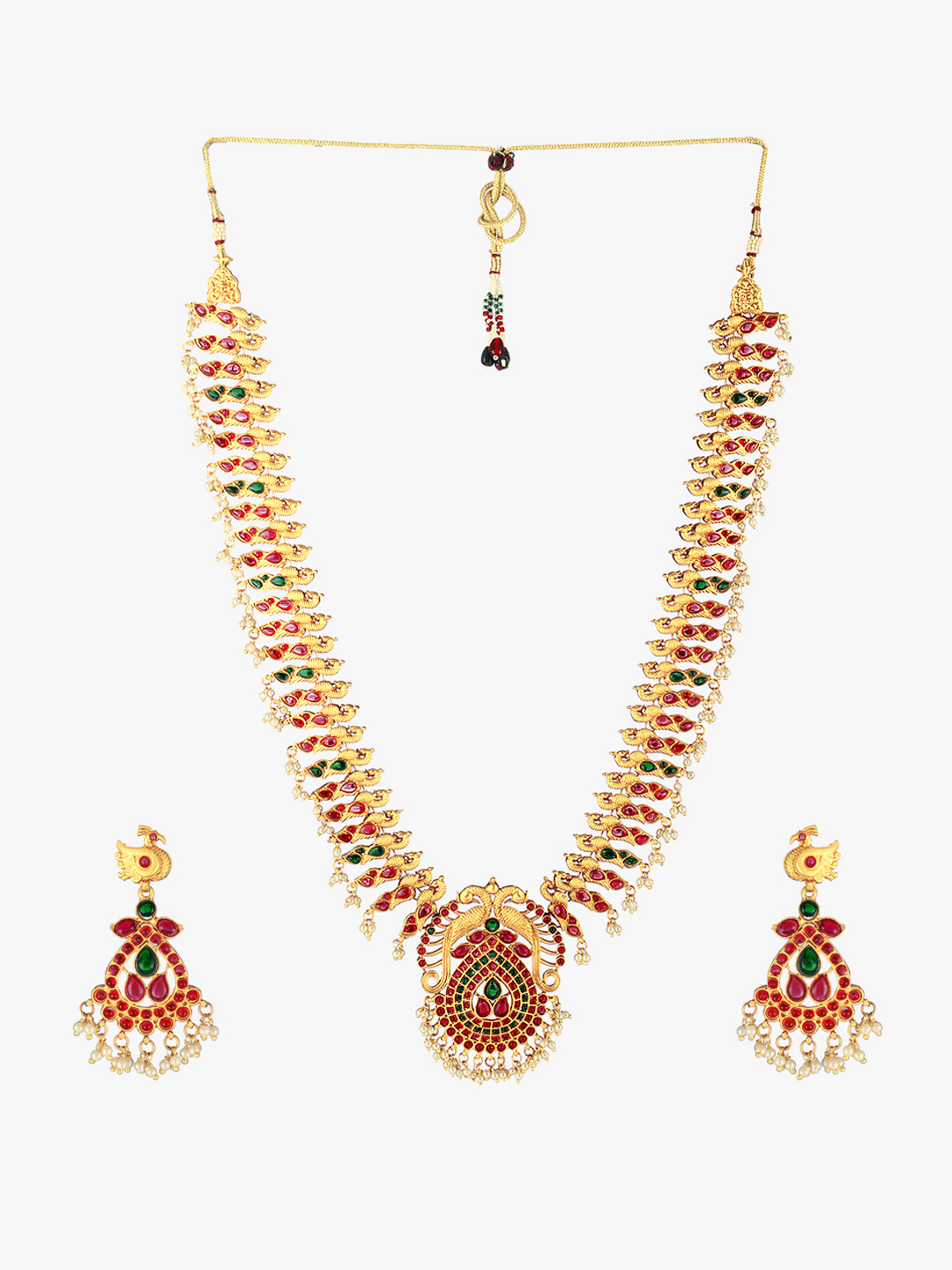 This Jewellery set consists of a necklace and a pair of earrings ,Gold-plated and Red and Green Stone-Studded stranded necklace with Drawstring closure,A pair of matching earrings, secured with a post and back closure,Gold plating is long lasting and non allergic to skin.