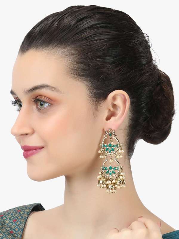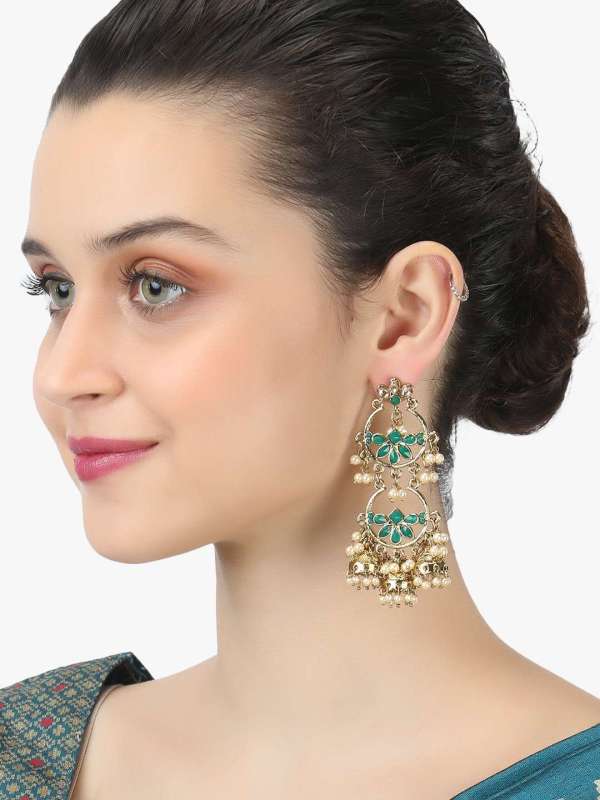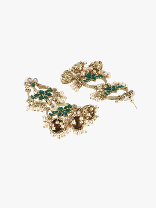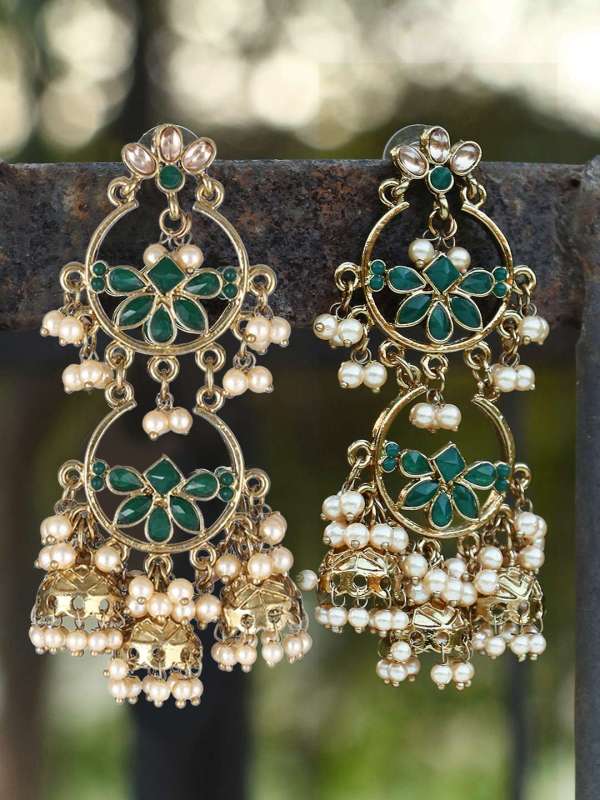 24CT Gold-Plated ,Green Stone Studded with pearls Jhumka Earing ,Secured with a post and back closure