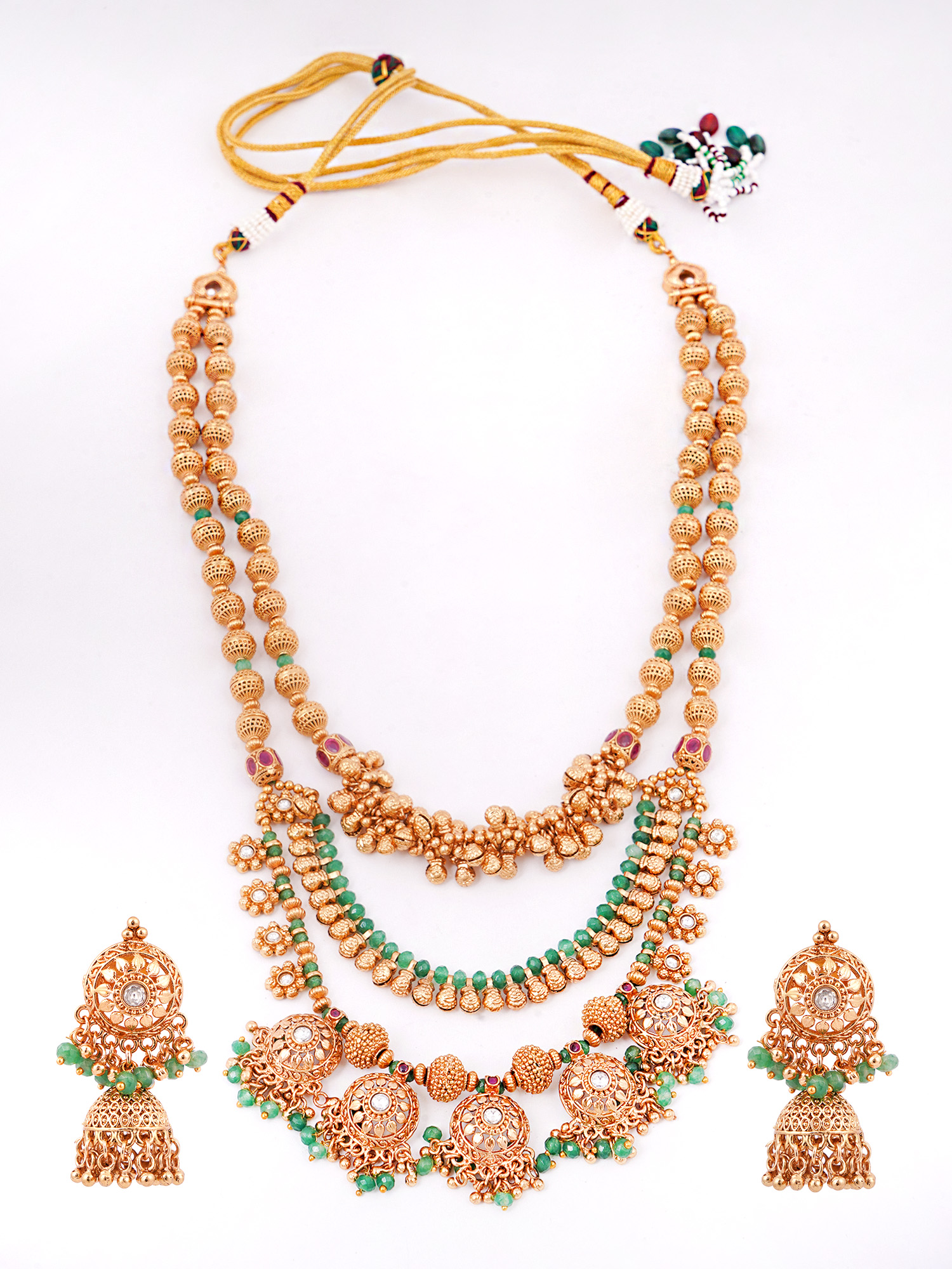 The 24CT Gold Plated Green Stone Studded Pearl Beaded Layered Jewellery Set is a stunning blend of regal charm and refined craftsmanship. This exquisite set features multiple layers of luminous pearls intricately arranged and complemented by captivating green stones, all elegantly encased in rich 24-carat gold plating. The layered design exudes opulence while maintaining a graceful flow, perfect for enhancing both traditional and contemporary ensembles. Ideal for weddings, festive occasions, or grand celebrations, this jewellery set is designed to be tarnish-resistant and durable, ensuring a lasting impression with every wear.