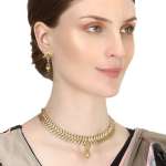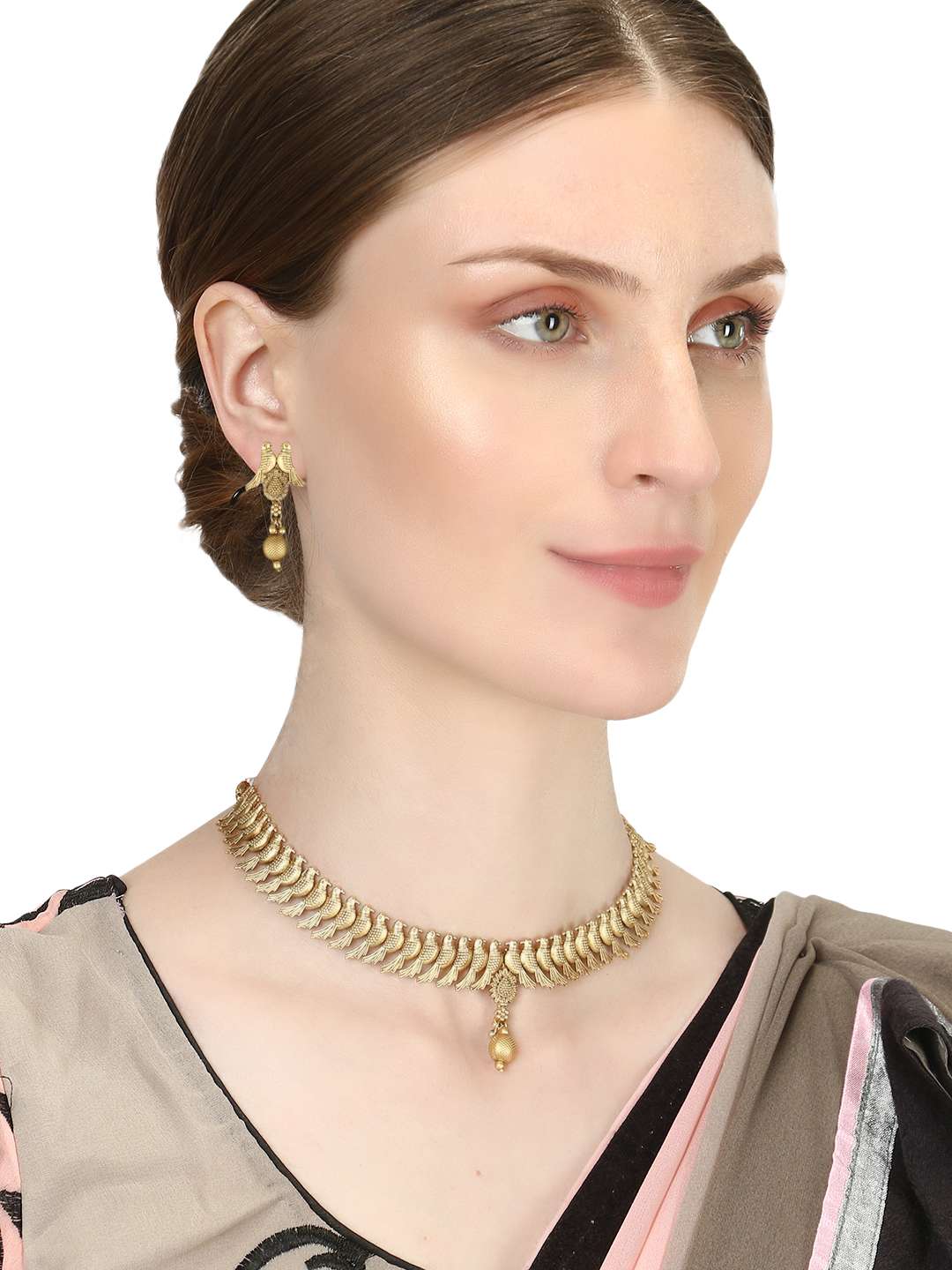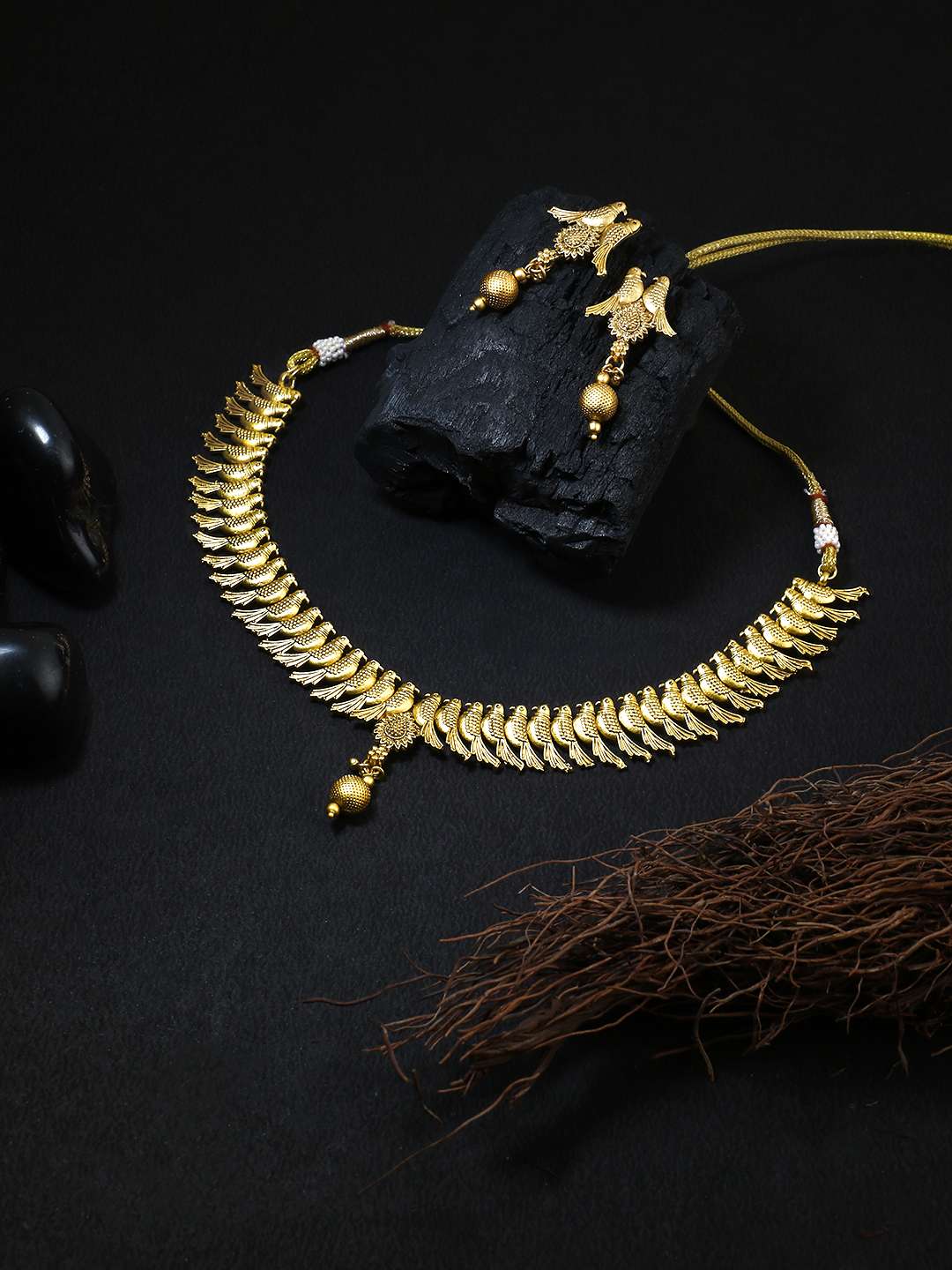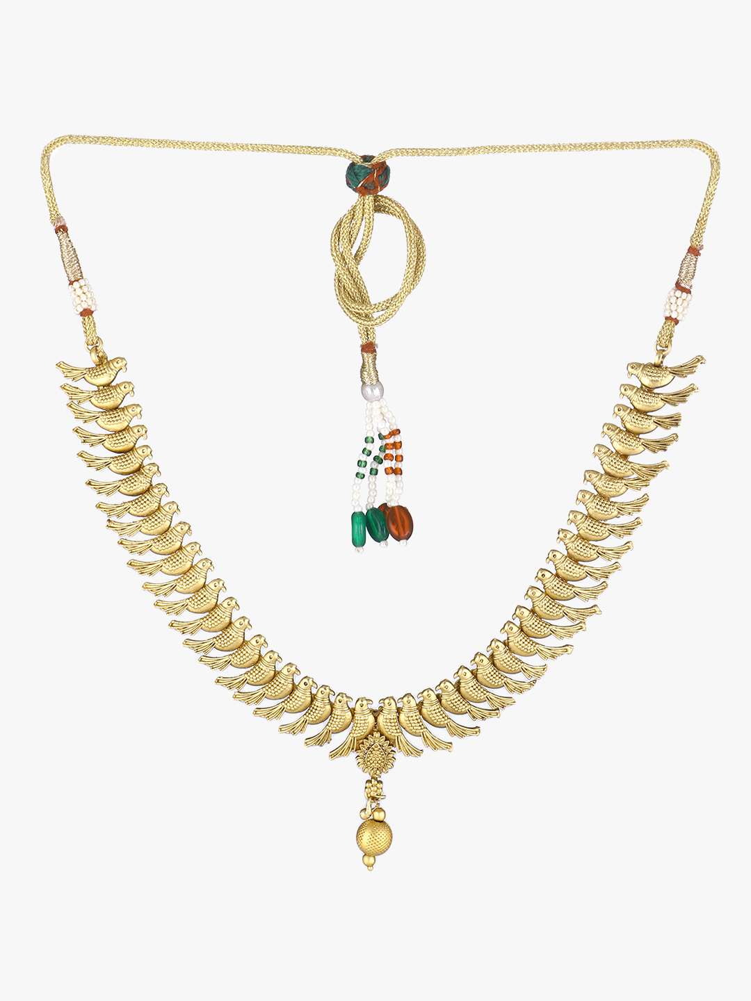 This Jewellery set consists of a necklace and a pair of earrings Gold-plated and stranded necklace with Drawstring closure, A pair of matching earrings, secured with a post and back closure, Gold plating is long-lasting and non-allergic to skin.