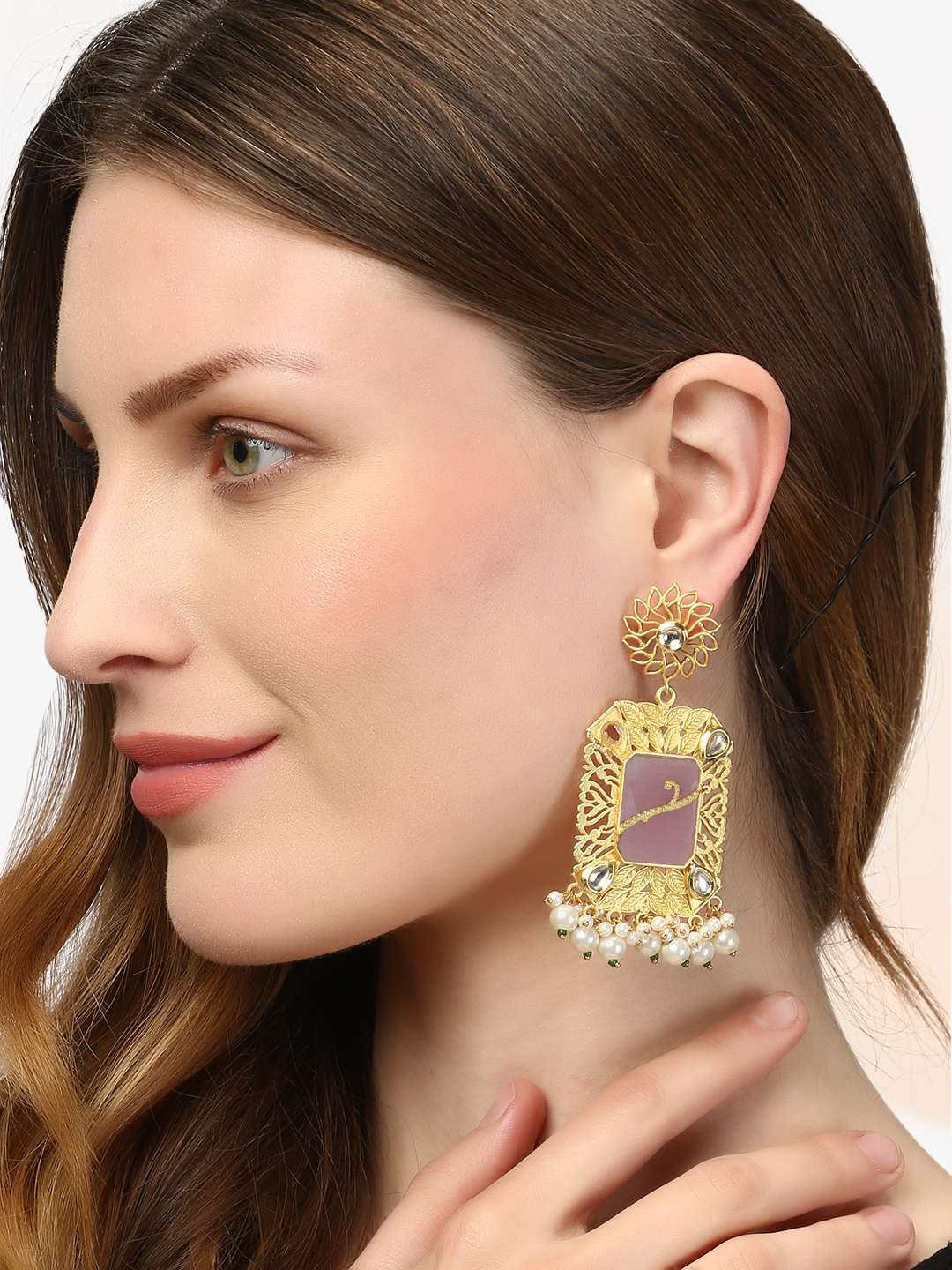 Women Gold-Plated Handcrafted Kundan with Pearls Pink Stone-Studded Earing Gold-plated,our Gold plating is long lasting and non allergic to skin,and has artificial stones,Secured with a fish-hook ear wire closure.