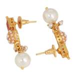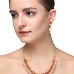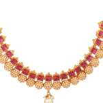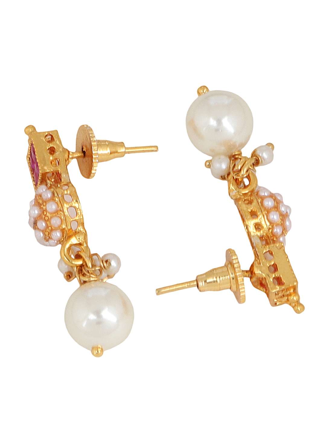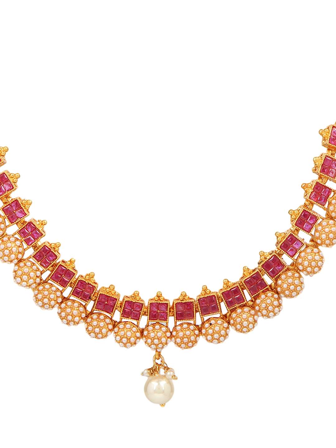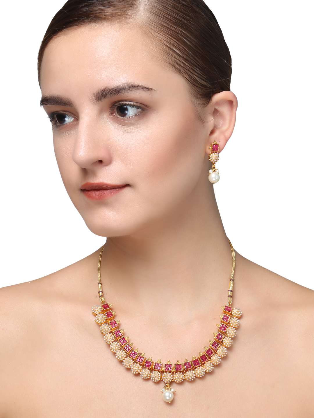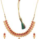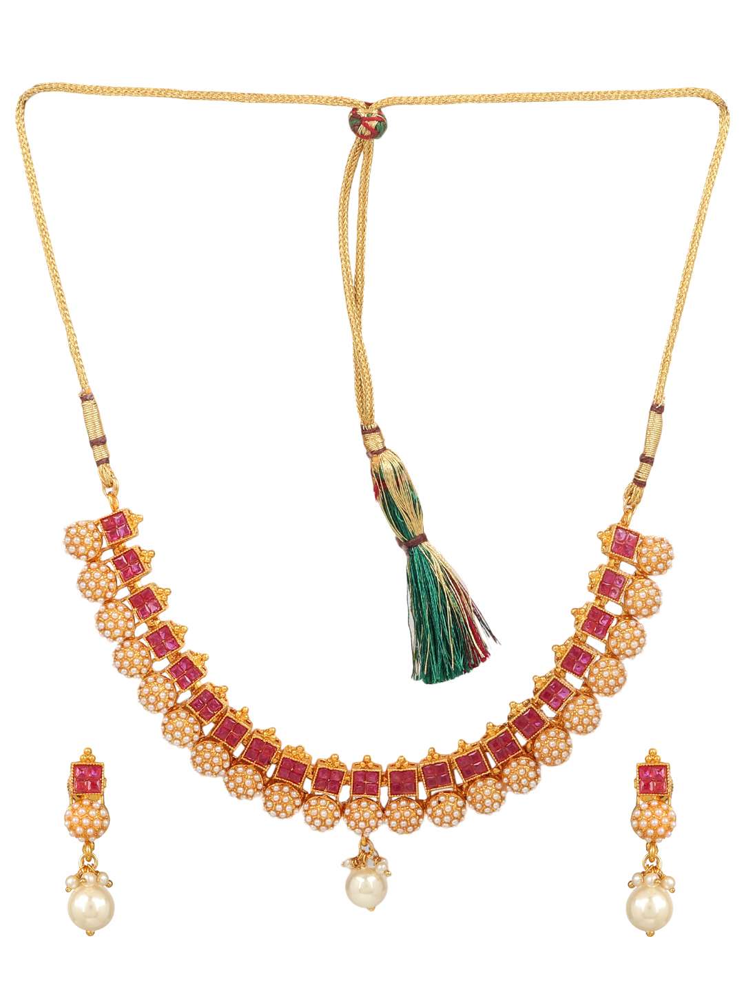 This jewellery set consists of a Necklace and earrings Gold-plated Antique Pearl Jewellery Set, has Red Stone-studded detail, secured with a Drawstring closure,A pair of matching embellished drop earrings, secured with post and back closure,Note: Gold plating is long lasting and non allergic to skin
