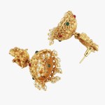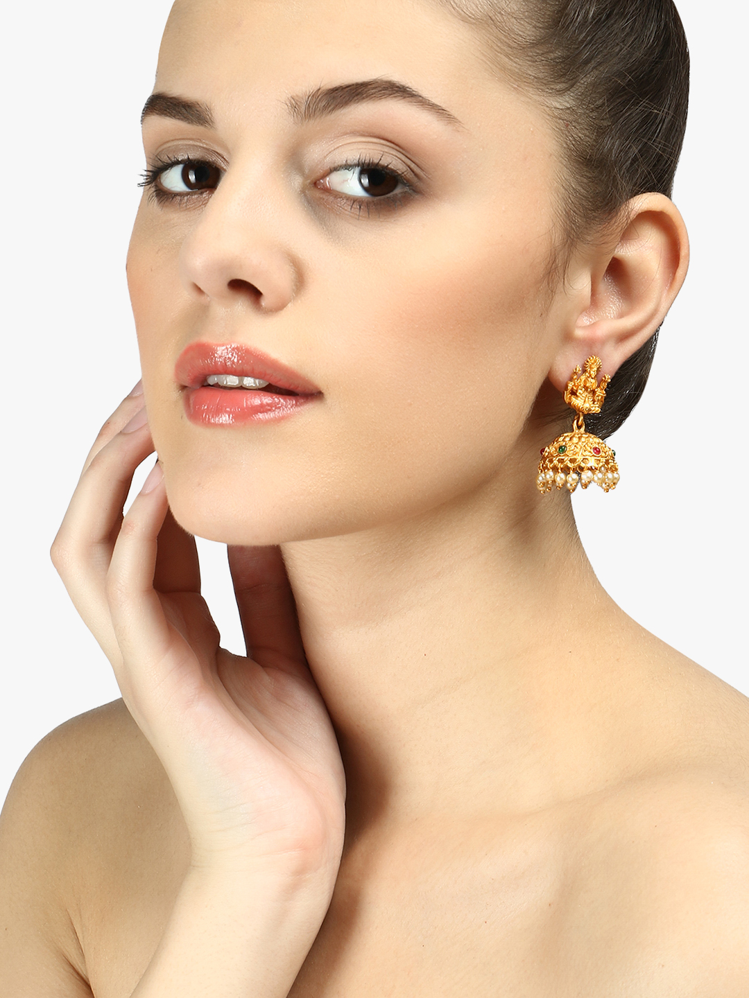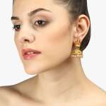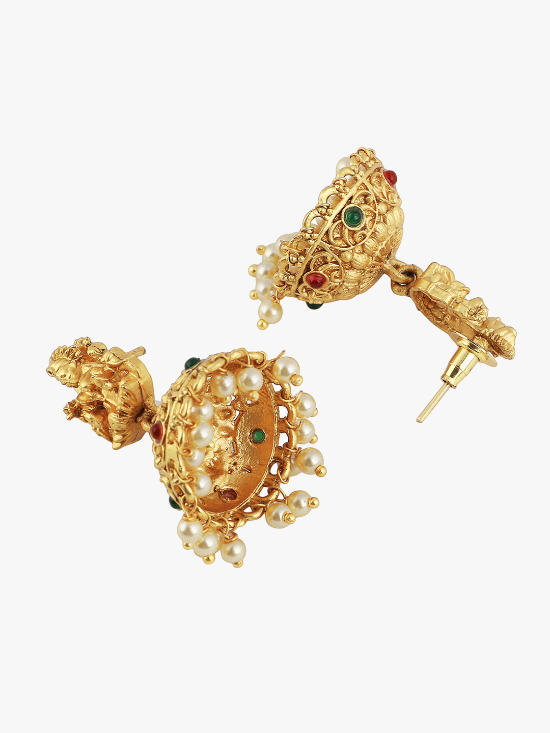 Women 24CT Gold-Plated Handcrafted Red-Green Stone-Studded temple Dome Shaped jhumki Gold-plated,our Gold plating is long lasting and non allergic to skin,and has artificial stones,Secured with a post and back closure.