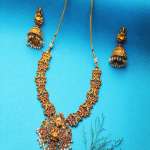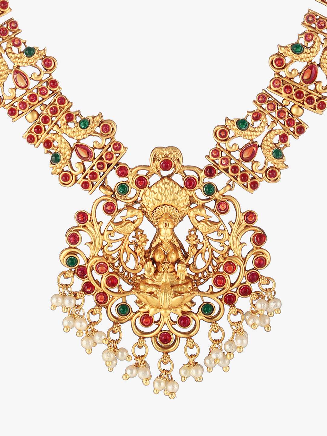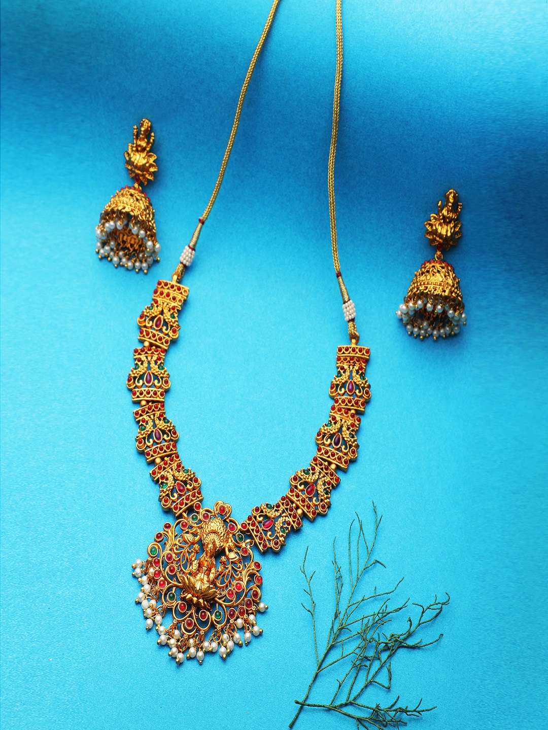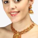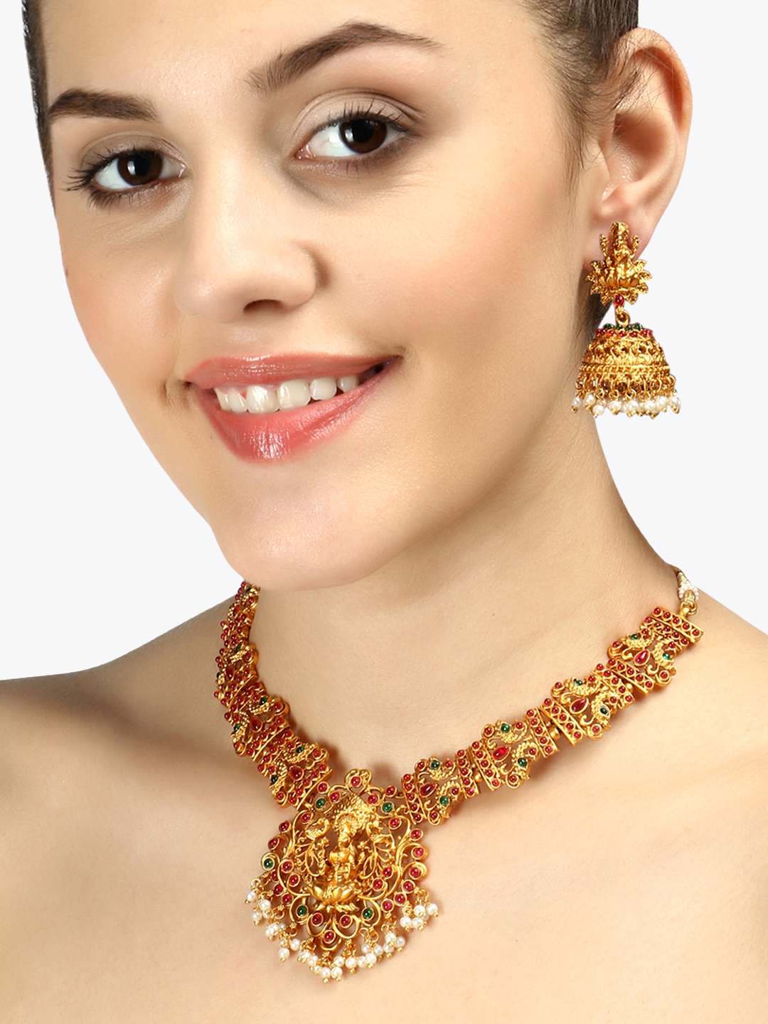 This Jewellery set consists of a necklace and a pair of earrings ,Gold-plated and Temple stranded necklace with Drawstring closure,A pair of matching earrings, secured with a post and back closure,Gold plating is long lasting and non allergic to skin.