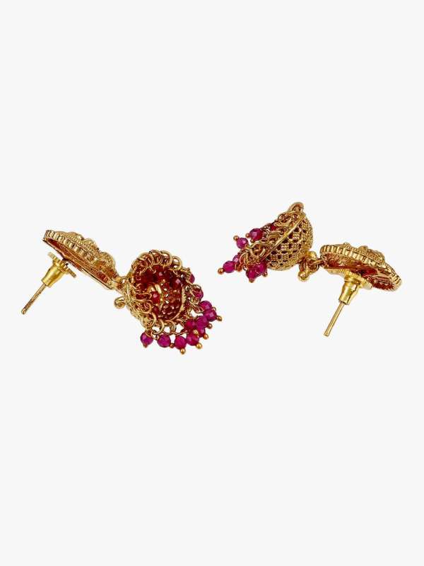 Women 24CT Gold-Plated Temple marhoon Stone -Studded Dome -Shaped Jhumkas Marhoon Pearl Copper Jhumki Earring,Gold-plated,our Gold plating is long lasting and non allergic to skin,and has artificial stones,Secured with a Post and Back closure.