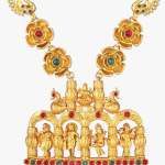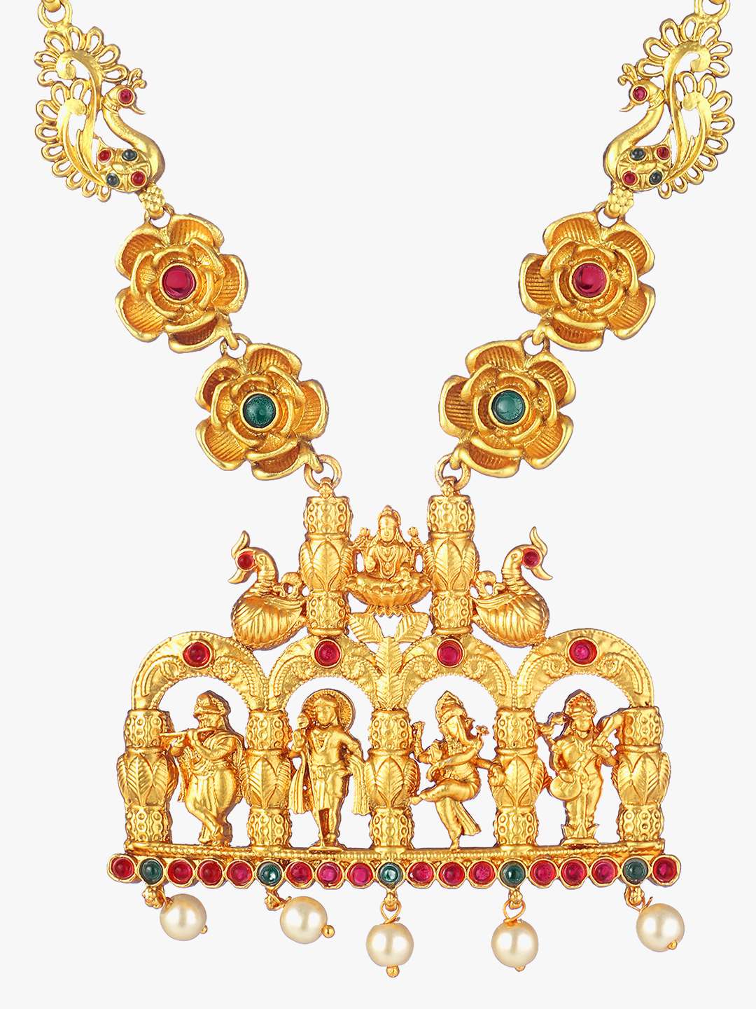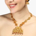 This Jewellery set consists of a necklace and a pair of earrings,24CT Gold-plated and Red and Green Stone-Studded stranded necklace with Temple artificial stones studded,with hook closure,A pair of matching earrings with artificial stones, secured with a post and back closure,Gold plating is long lasting and non allergic to skin.