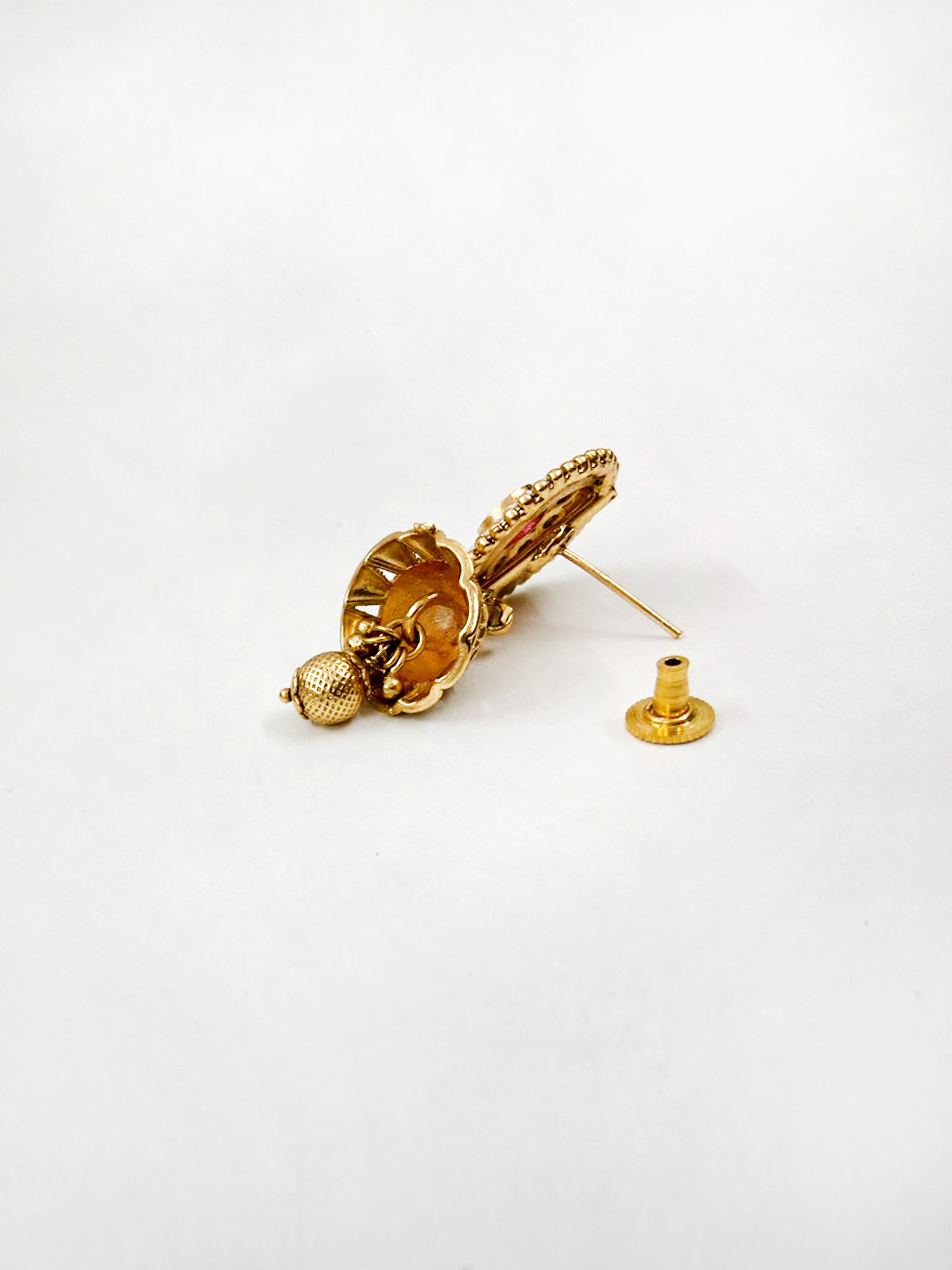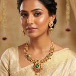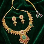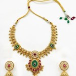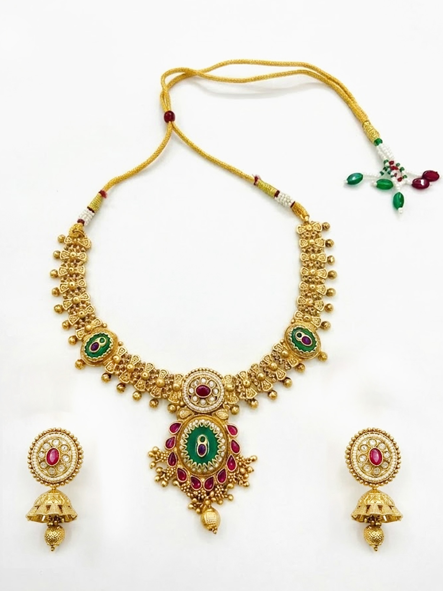 | A necklace with an antique-style matt gold finish that lends a soft, vintage glow instead of a high-shine glare. The muted gold tone evokes heritage charm, giving the piece a classic, old-world aesthetic. Distinctive spike or pointed motifs along the necklace — these spikes give the necklace a striking and regal silhouette, making it a bold, statement accessory rather than something subtle or minimalist. A matching pair of earrings, designed to complement the necklace perfectly, rounding off the set into a coordinated ensemble that completes a traditional or festive look. |