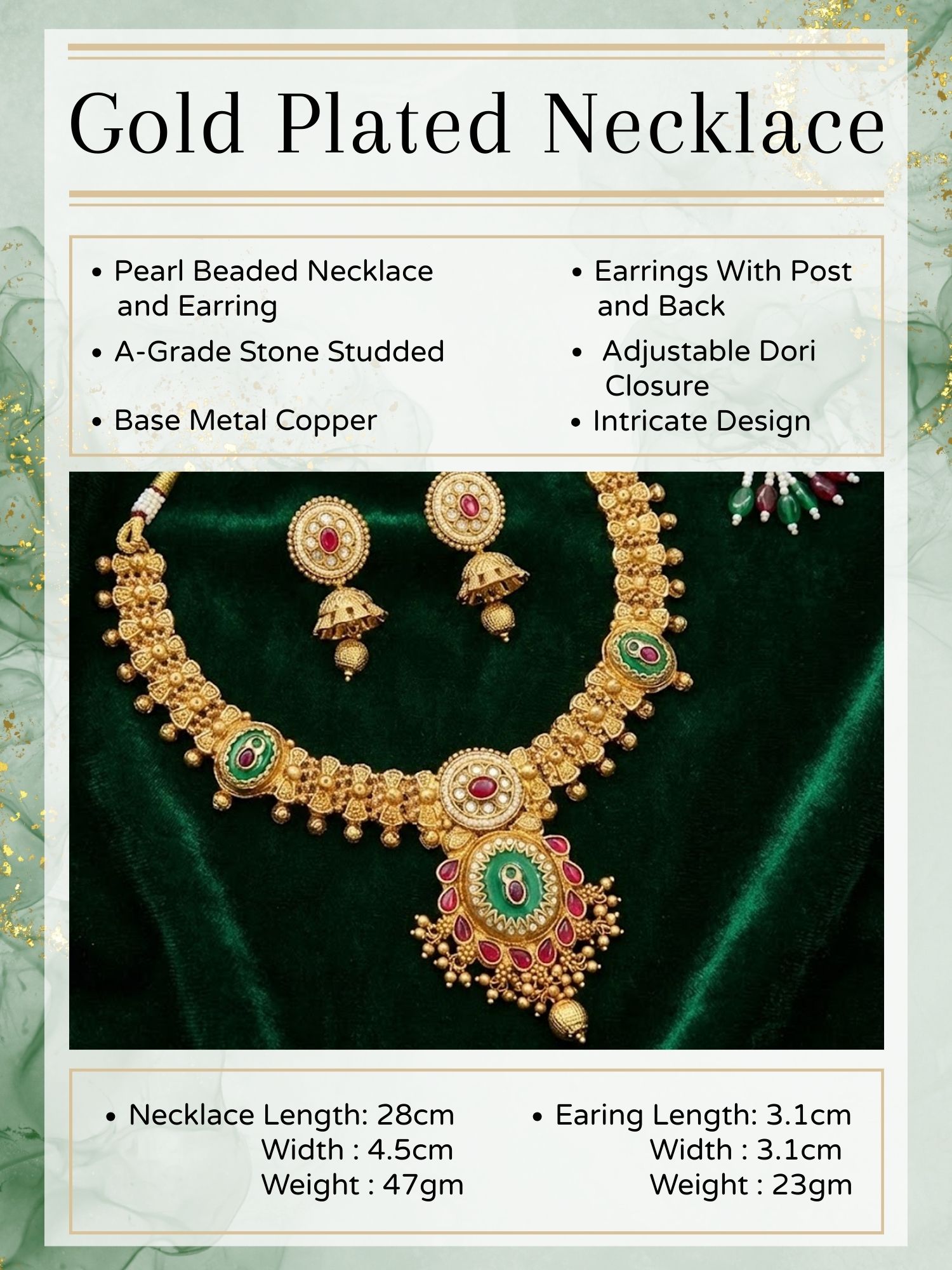 Necklace Length: 16.3cm, Necklace Width: 3.4cm, Earing Length: 4.7cm, Earing Width: 2cm, Weight: 74 gm