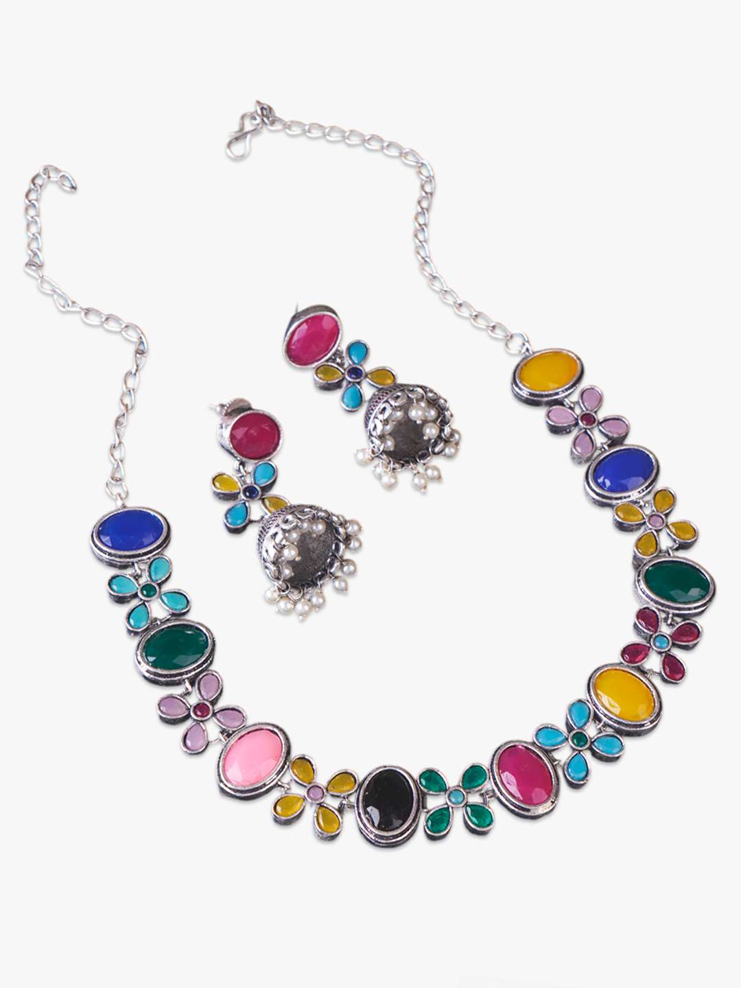 Women Siver Plated Oxidised Multicolor Stone Jewellery Set with S-Hook Closure, A pair of matching embellished Studs earrings, secured with post and back closure, Note: Silver-Plating is long lasting and non allergic to skin.