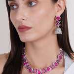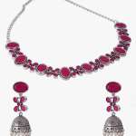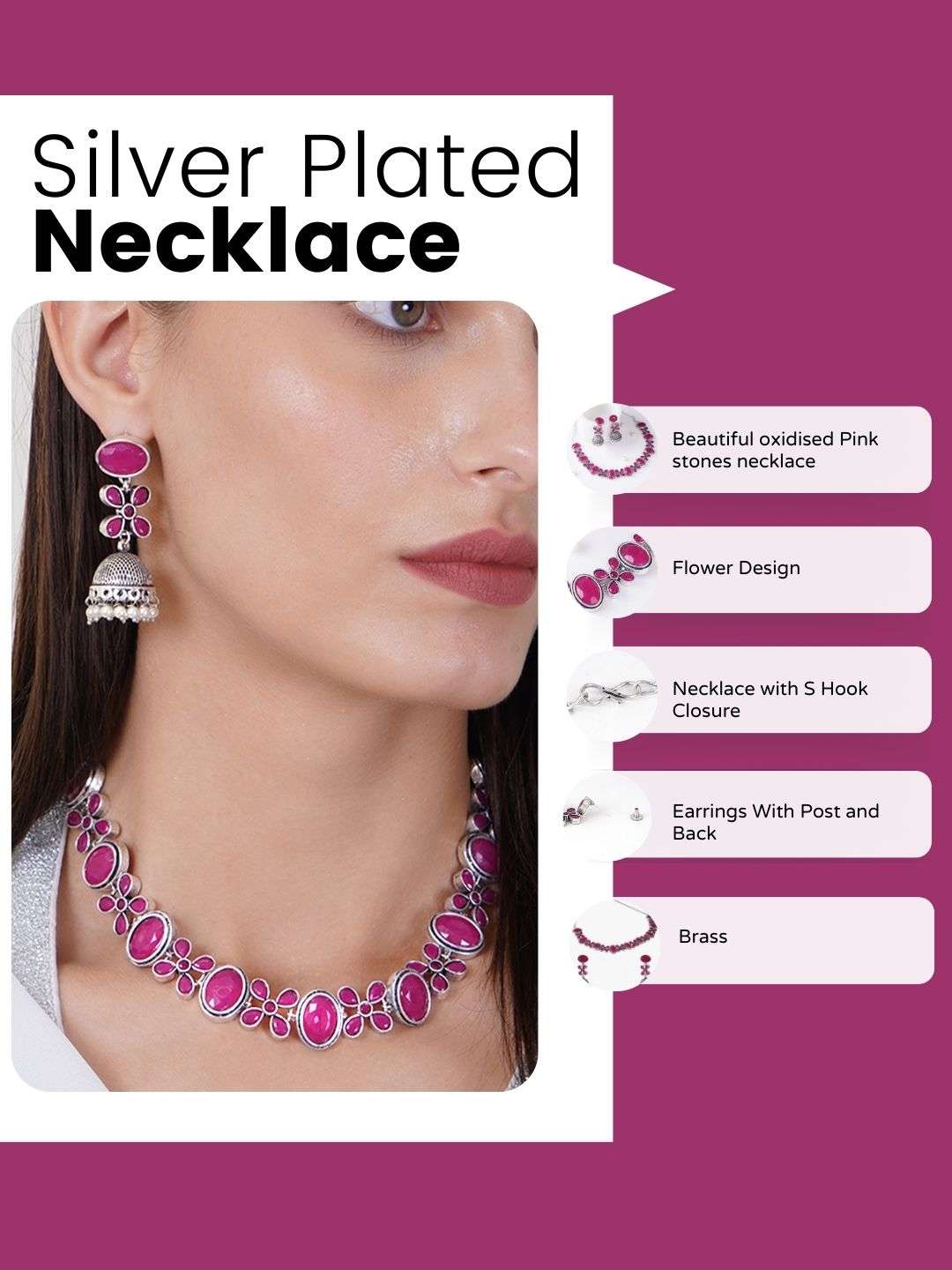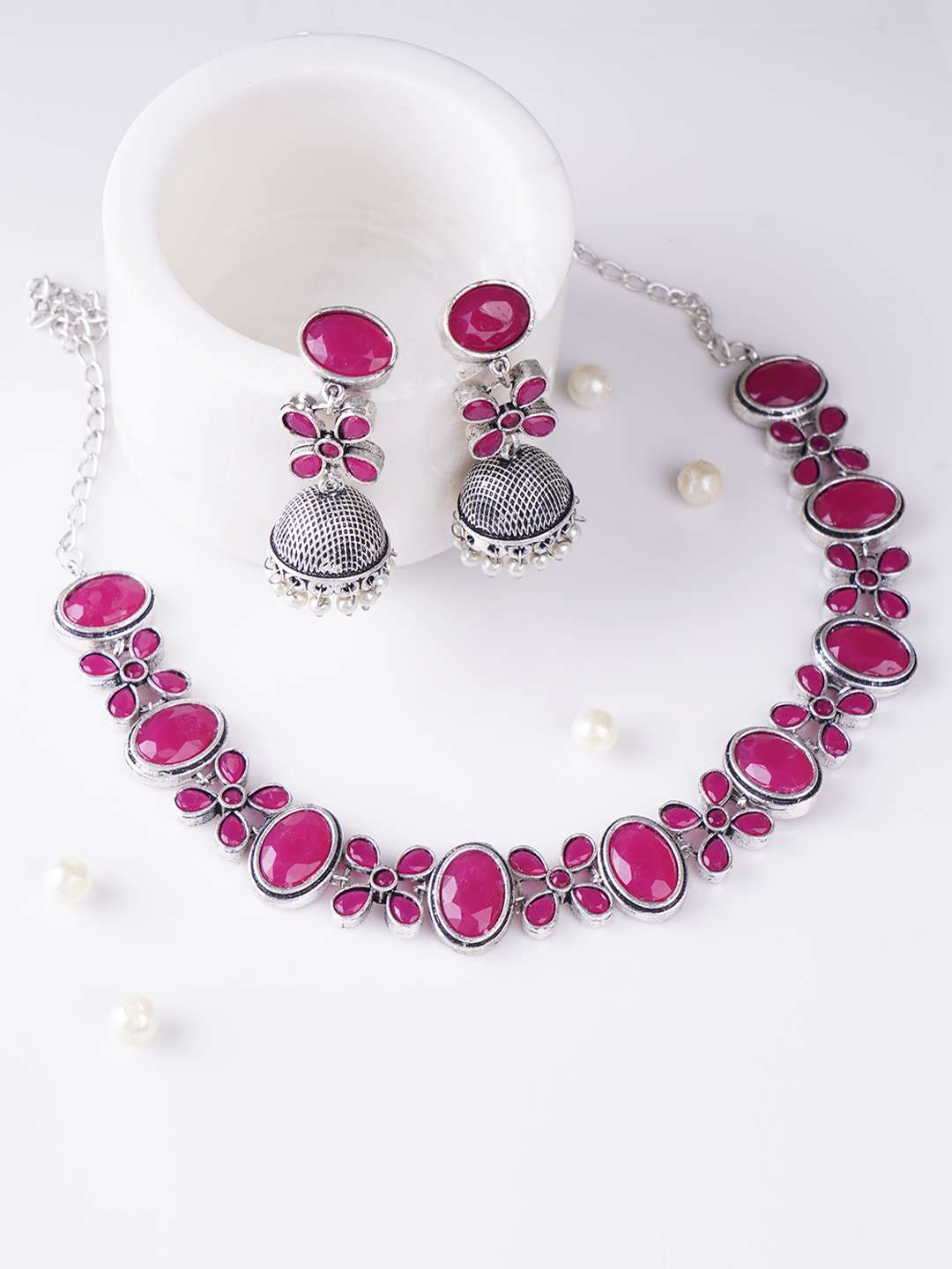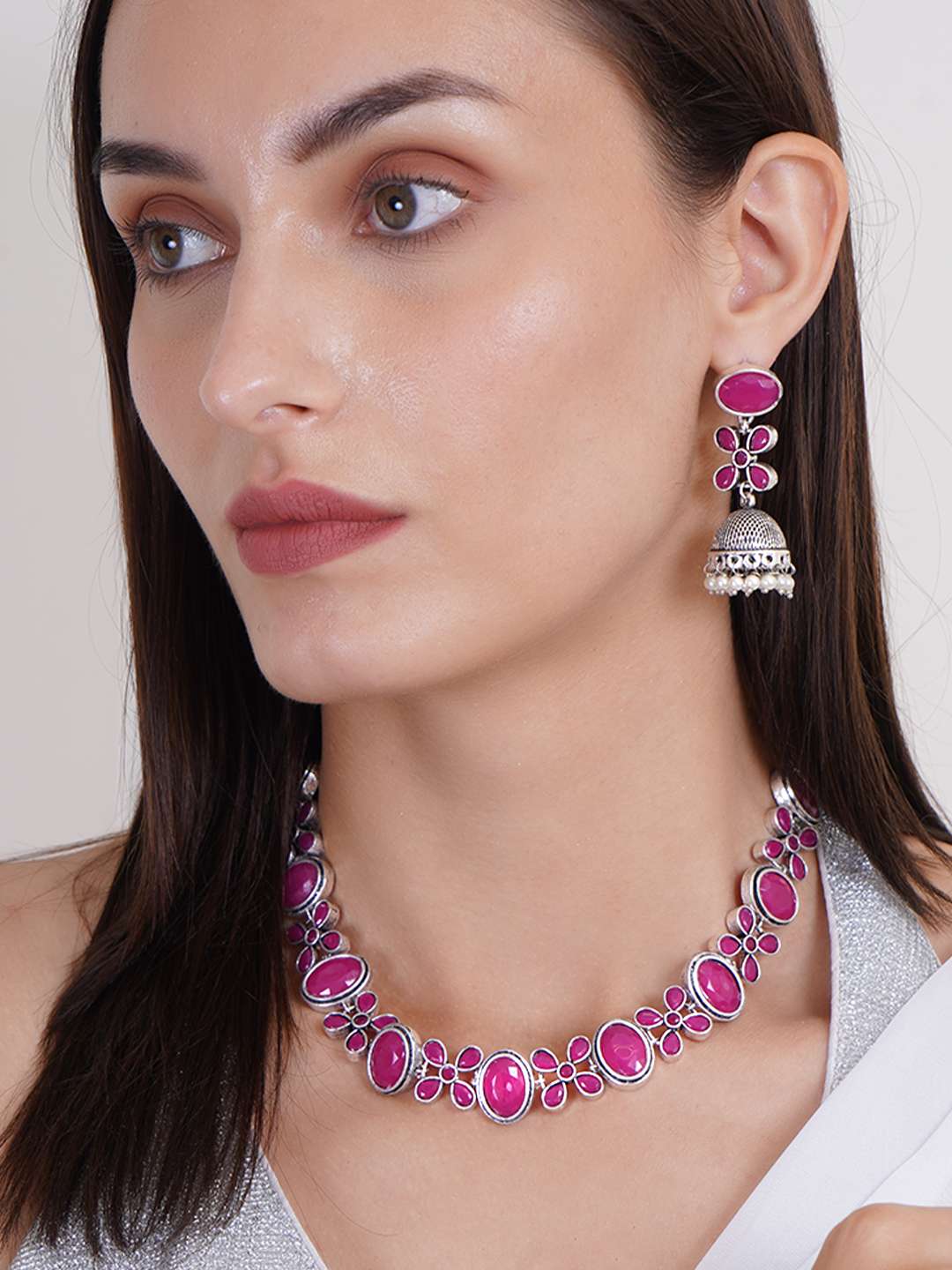 Women Siver Plated Oxidised Pink Stone Jewellery Set with S-Hook Closure, A pair of matching embellished Studs earrings, secured with post and back closure, Note: Silver-Plating is long lasting and non allergic to skin.
