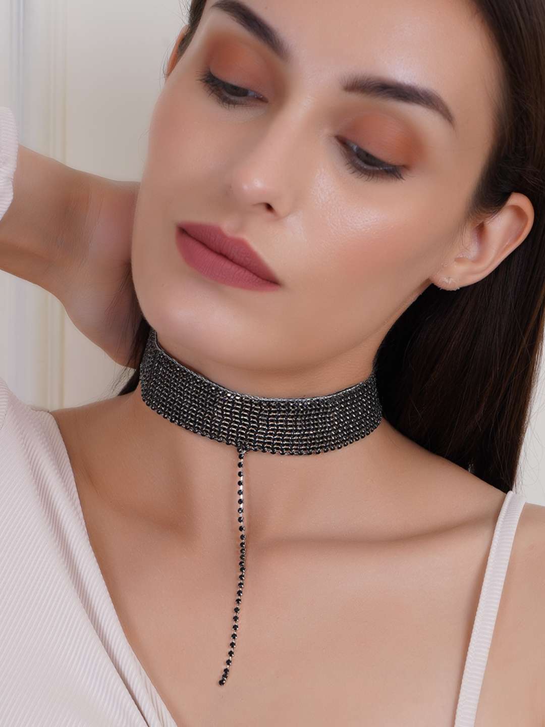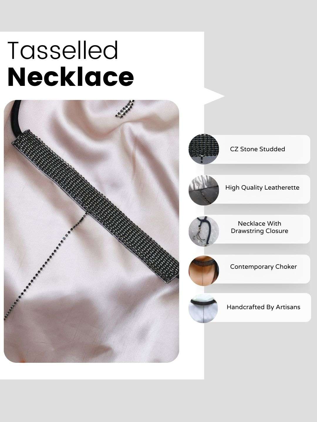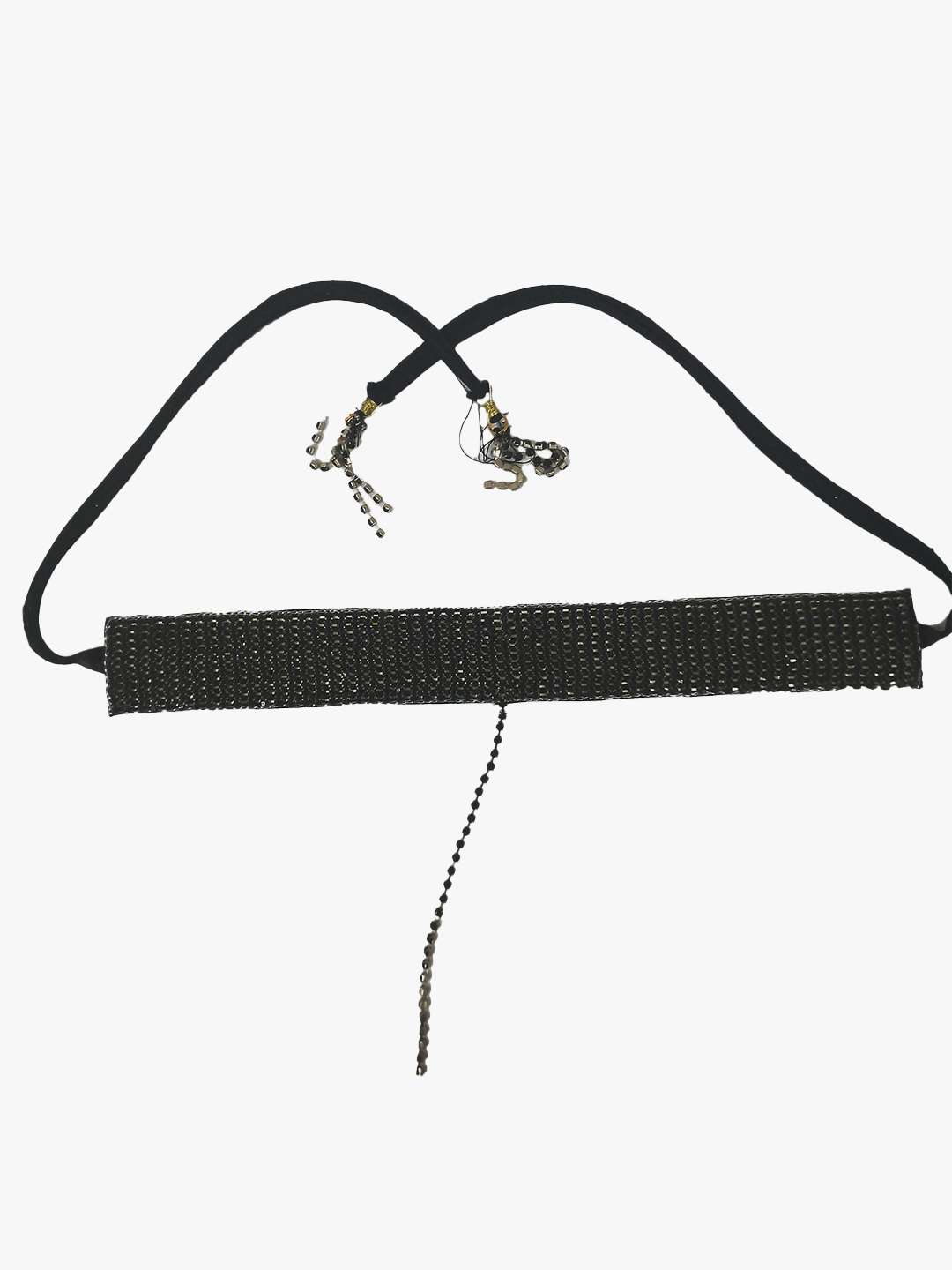 Women Black Stone Studded Silver Beaded and Tessel Necklace Set with Drawstring Closure. This a very Beautiful Handcreafted Set. Its Looks Stunning with your Wetern and Ethnic Outfit.