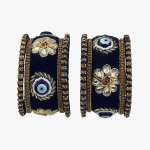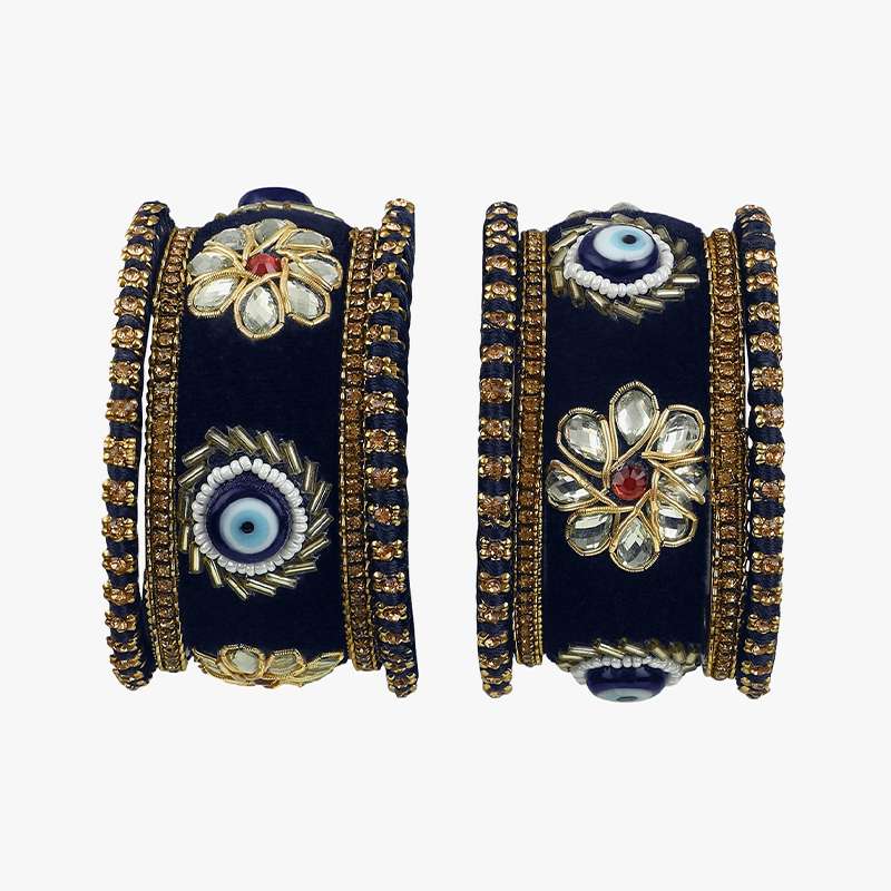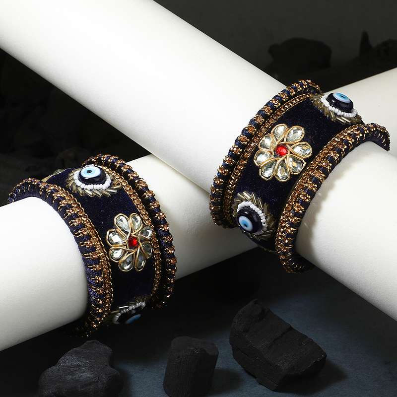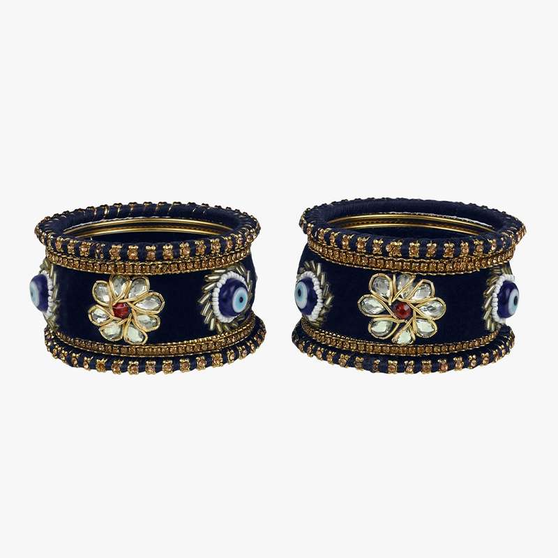 Women 24CT Set of 10 gold-plated Blue Kundan Stone-Studded a Velvet Silk Thread Chuda Chura Bangle Set embellished chura chuda bangles with intricate textured detailing, has kundan studded, slip-on closure,our gold plating is long lasting and non allergic to skin.