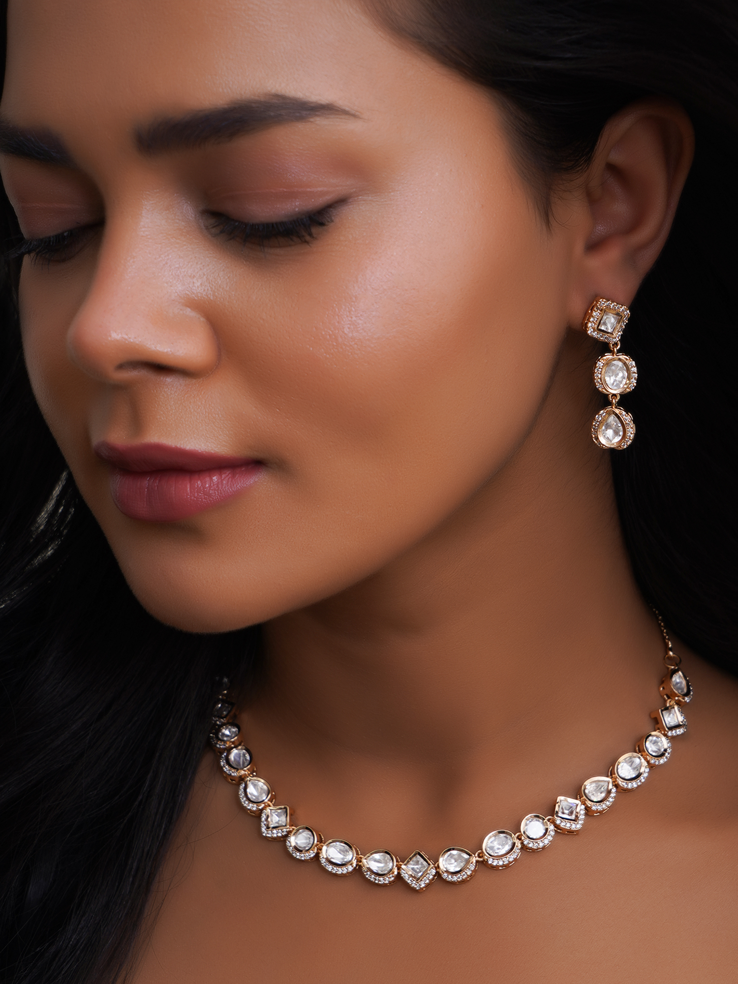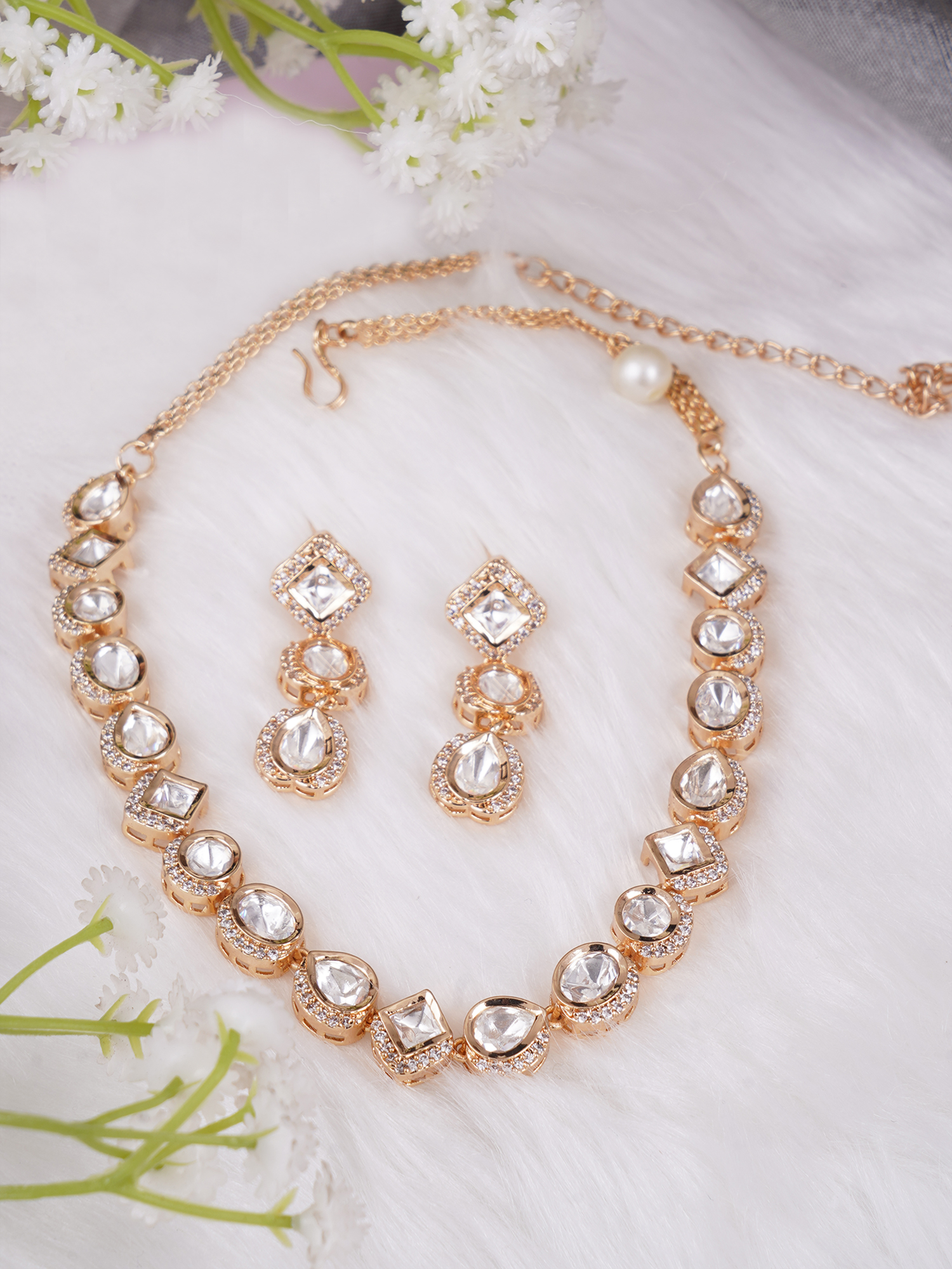 Women Gold Plated AD Stone Studded Kundan Jewellery Set with S-Hook Closure, A pair of matching embellished Drop earrings, secured with post and back closure, Note: Gold-Plating is long lasting and non allergic to skin.