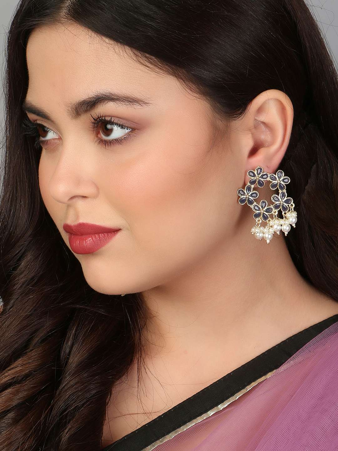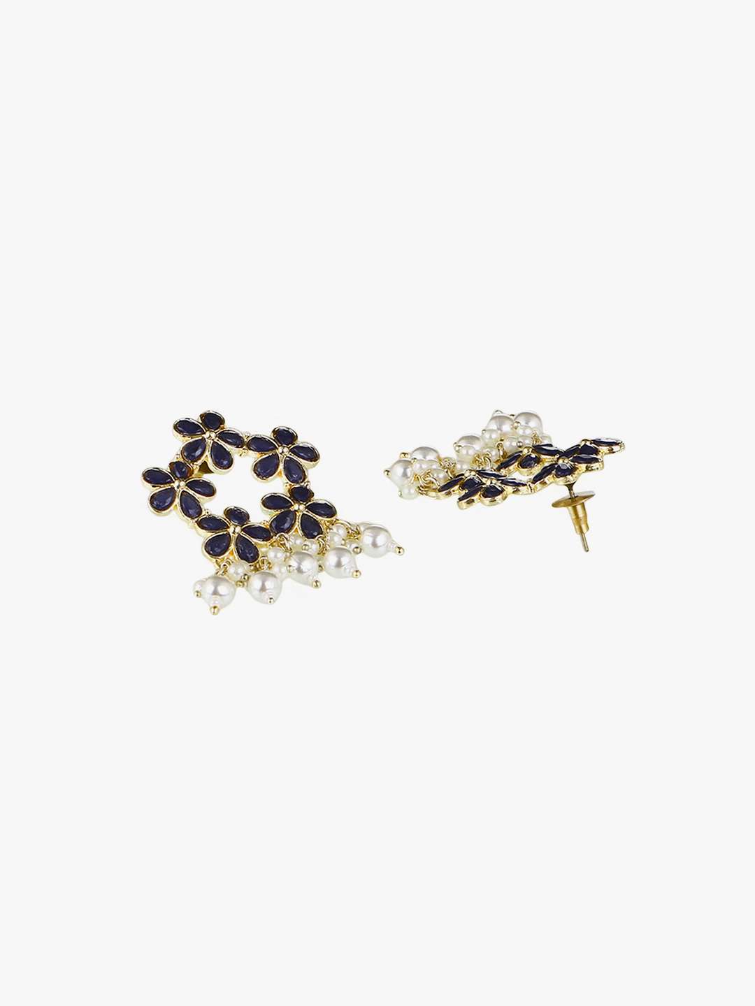 Gold-Plated Black Stone-Studded Pearl-Tessel Drop Earrings. Our Gold plating is long lasting and non allergic to skin,and has artificial stones,Secured with a fraction Back closure.