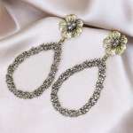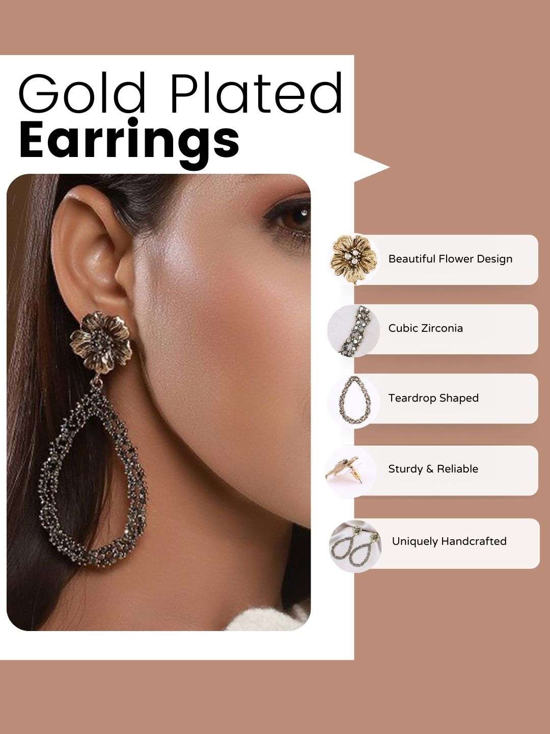 Gold Plated CZ Stone Studded Flower Design Teardrop Shape Dangle Earrings, Has Push back Closure. Our Gold Plating is long lasting and non-allergic to skin