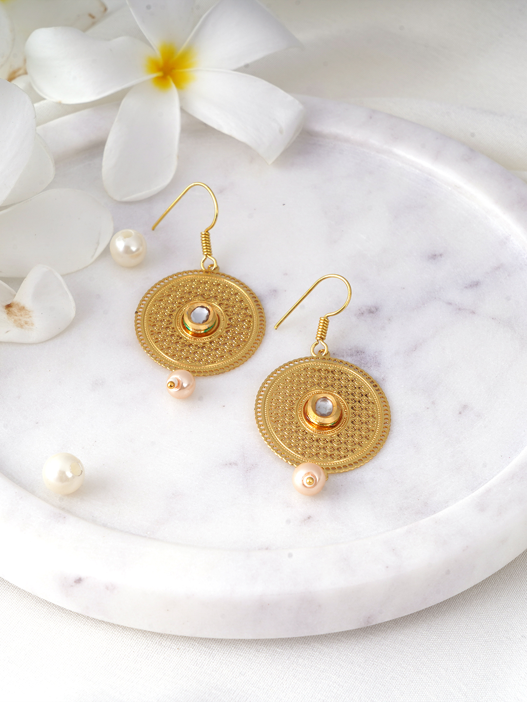 Gold Plated Mandala Design Pearl Tessel Earrings