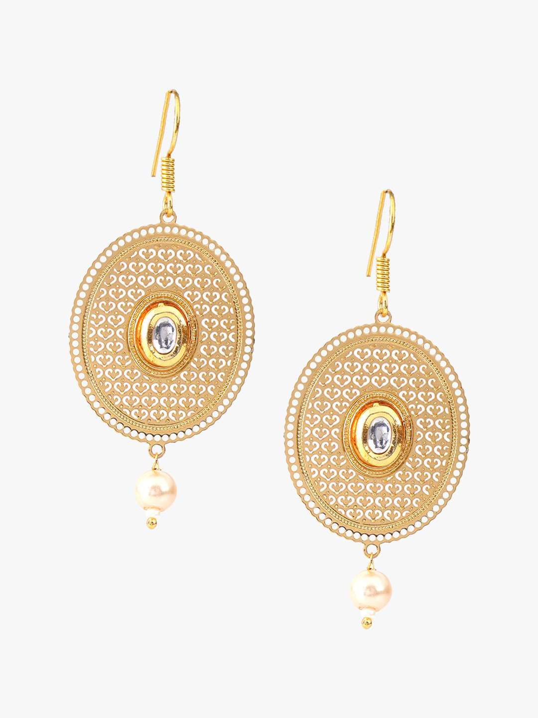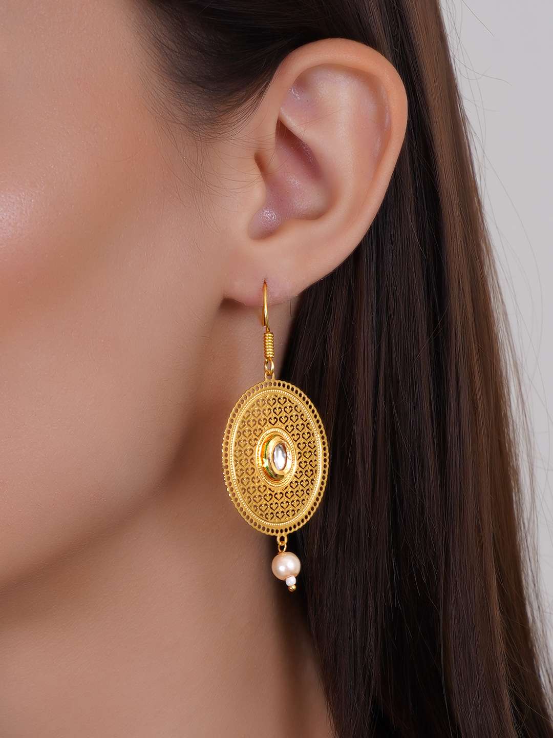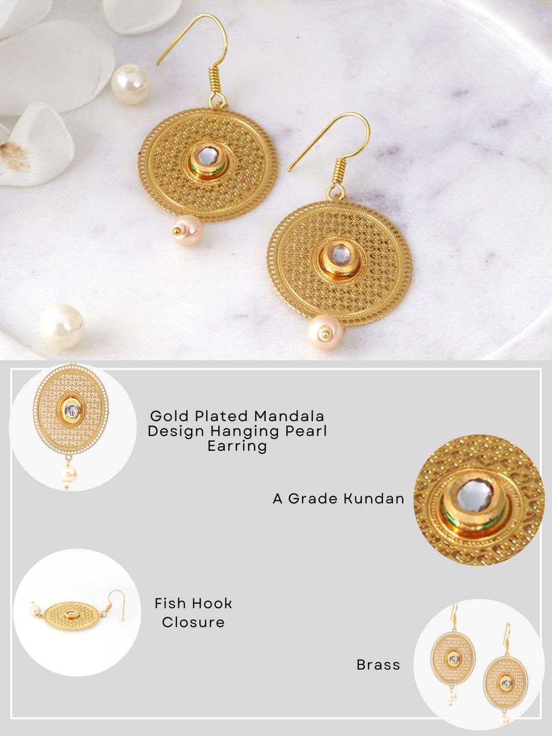 Gold Plated Kundan Studded Mandala Design Hanging Pearl Traditional Earrings. Our Gold Plating is long lasting and non-allergic to skin. It Give you a beautiful elegant look with our outfit.