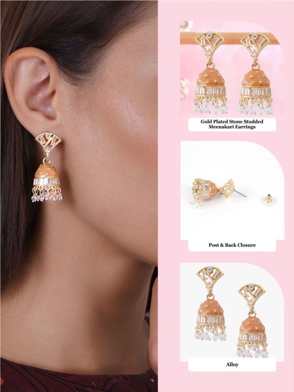 Gold Plated Meenakari Jhumki Earrings. Our Gold Plating is long lasting and non-allergic to skin. It Give you a beautiful elegant look with our outfit.