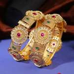 Women Gold-Plated Pink and Green Stone-Studded Bangles. Our gold plating is long lasting and non allergic to skin.