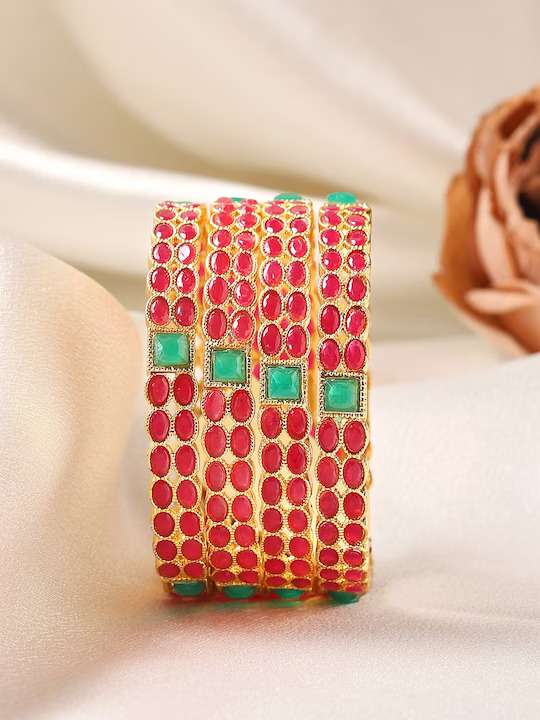 Gold-Plated Pink & Green Stone-Studded Sustainable Handcrafted Bangles