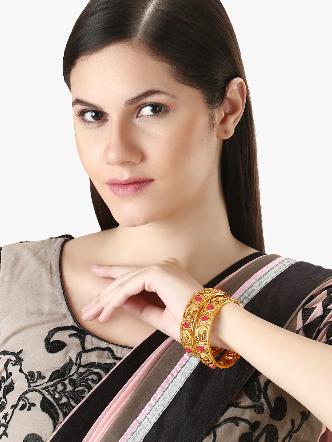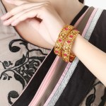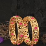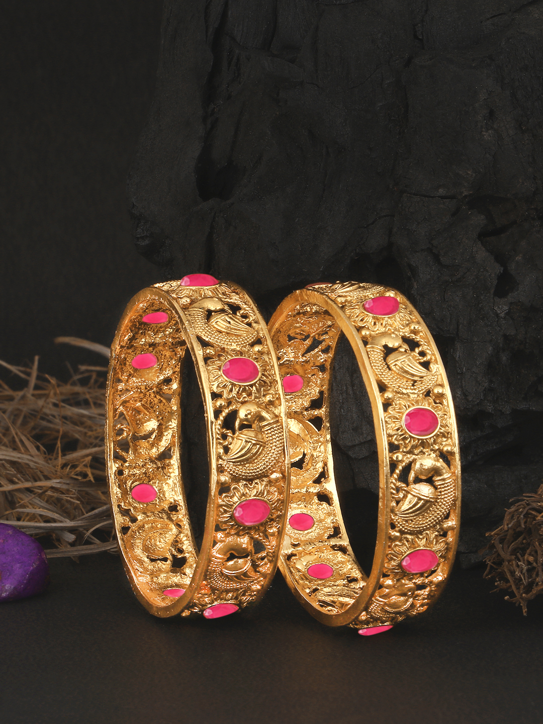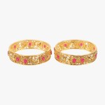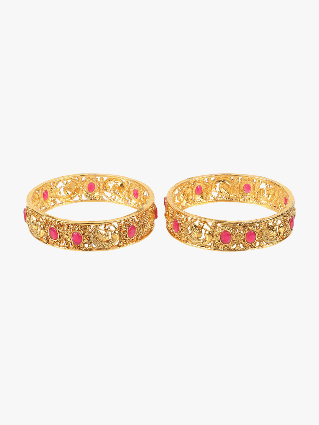 Women Set of 2 24CT Gold-plated Pink Stone-Studded handcrafted bangles,each has an intricate textured pattern,our Gold plating is long lasting and non allergic to skin.
