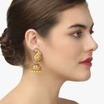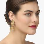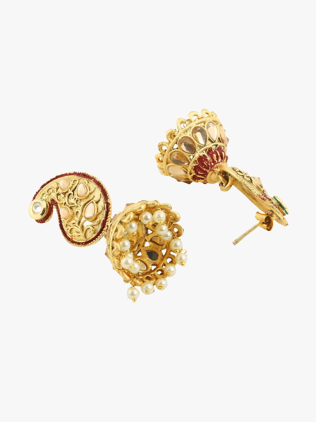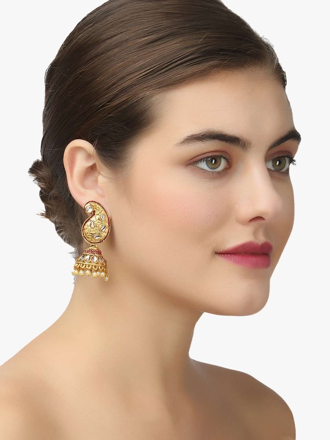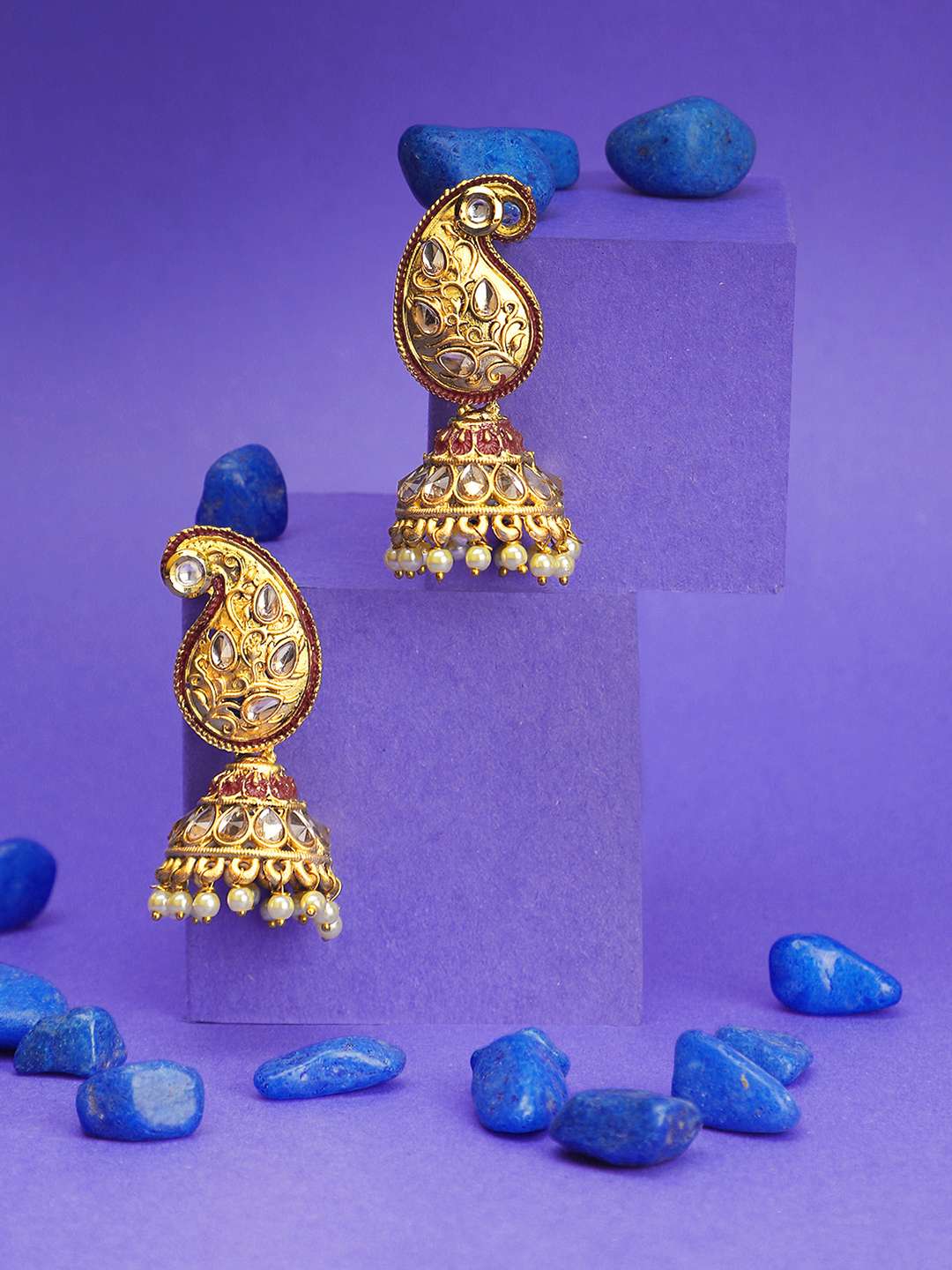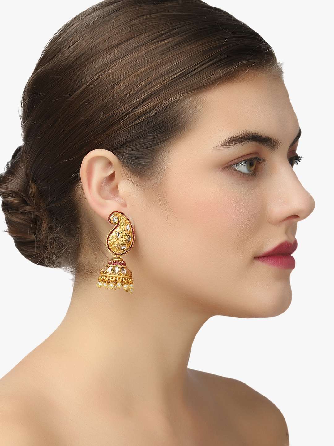 Women Gold-Plated stone studded Carry-Shaped Jhumkas Copper Jhumki ,Gold-plated,our Gold plating is long lasting and non allergic to skin,and has artificial stones,Secured with a post and back closure.