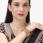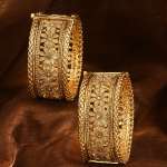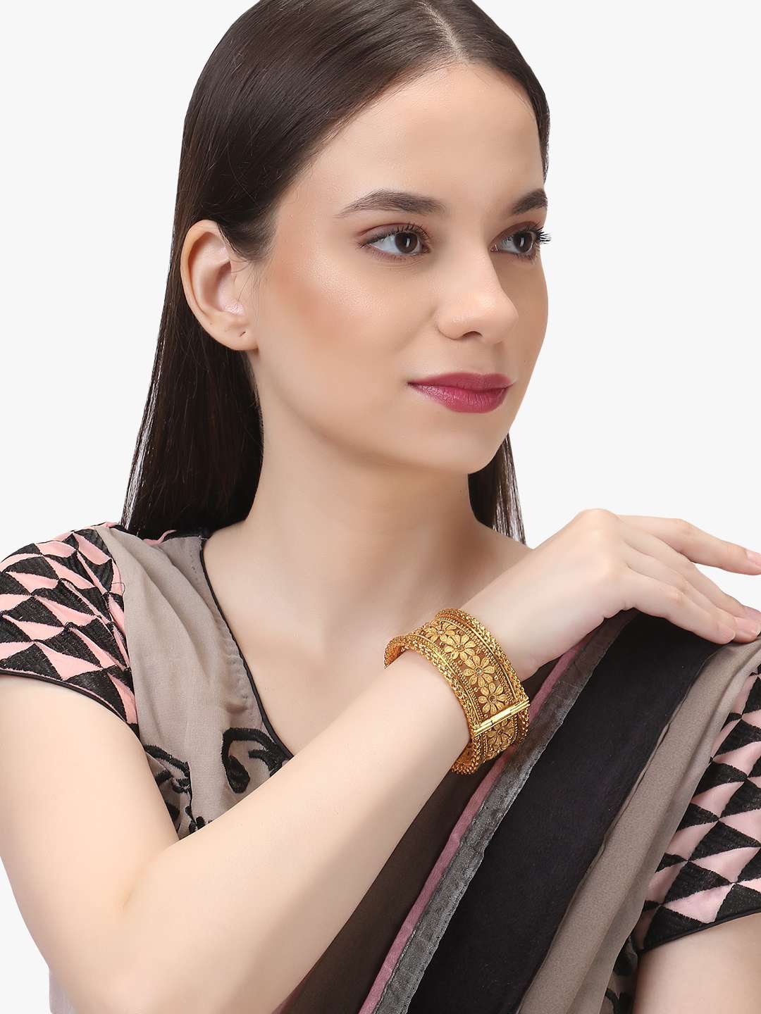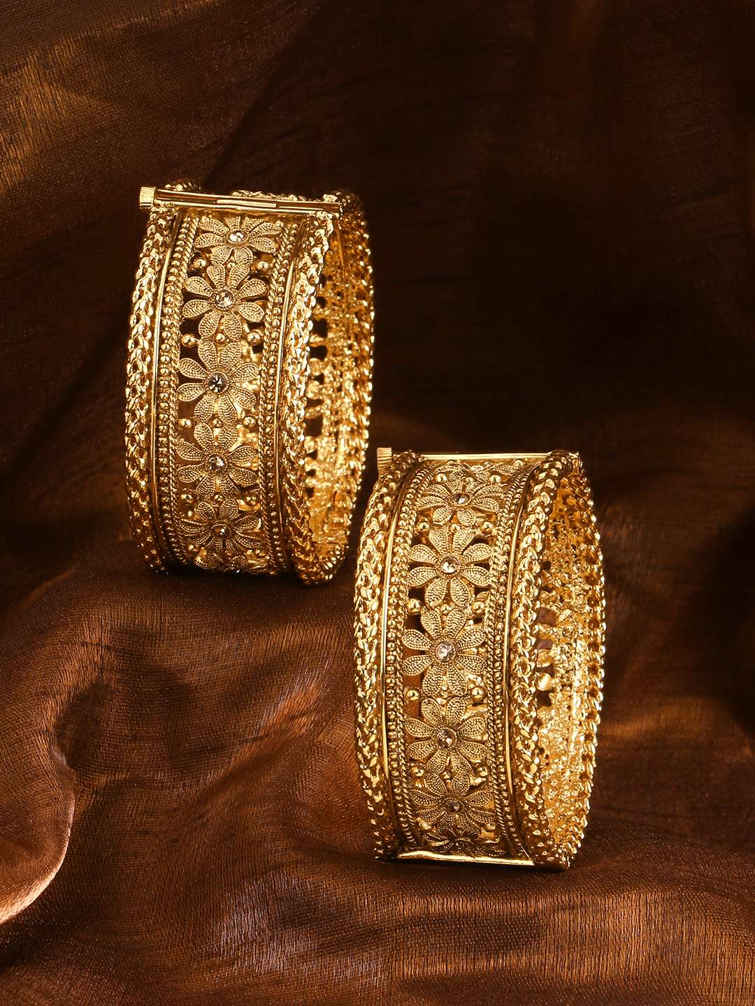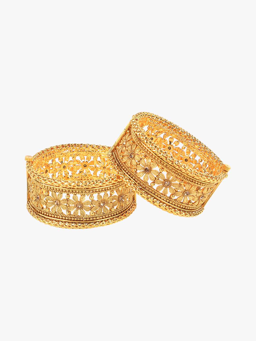 Women Set of 2 24CT Gold-plated Stone-Studded Flower handcrafted bangles,each has an intricate textured pattern,secured with a screw closure,our Gold plating is long lasting and non allergic to skin.