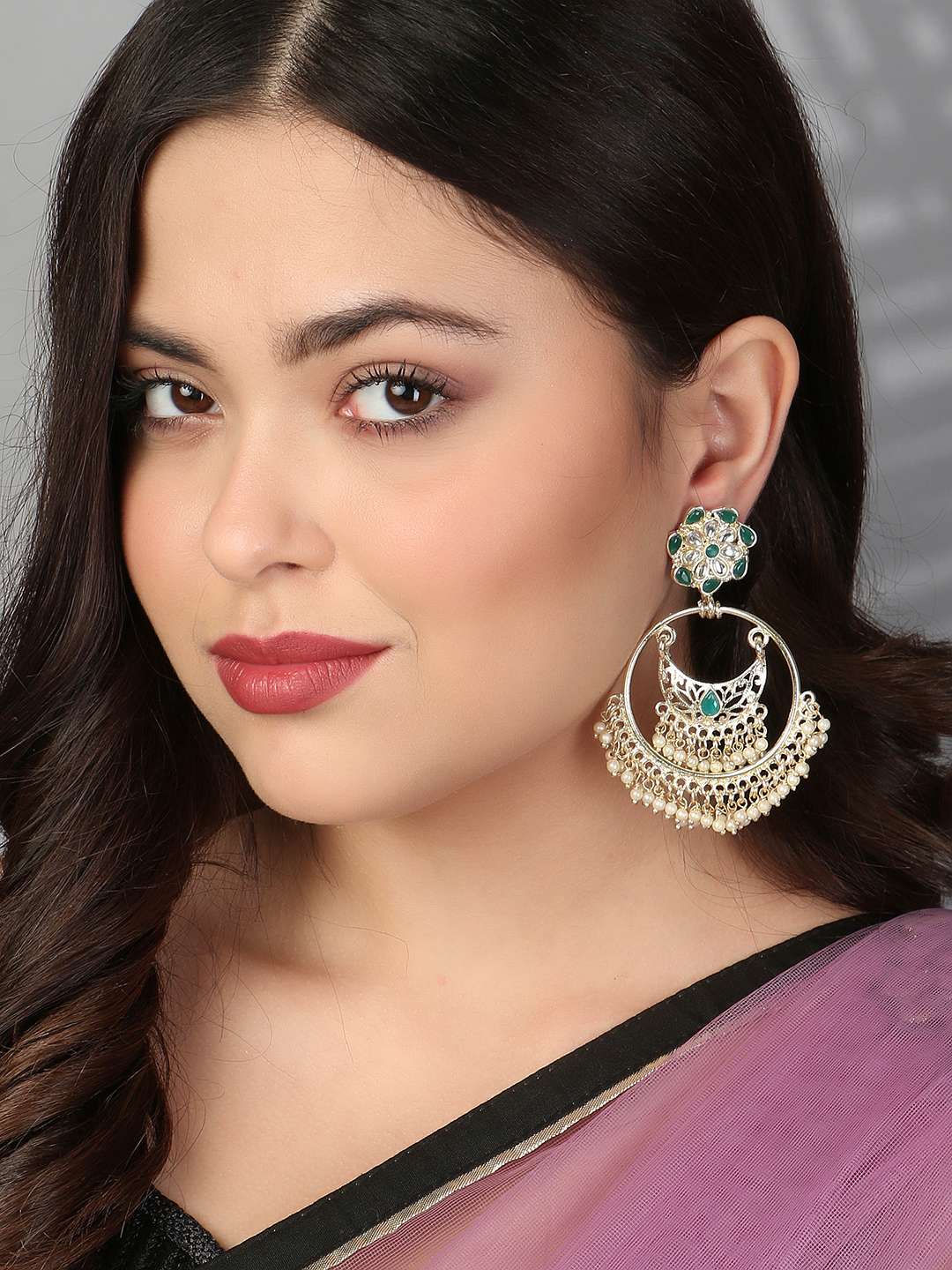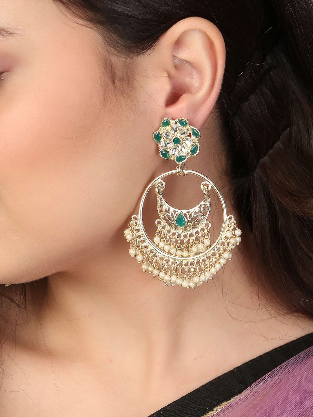 Gold-Plated Stone-Studed Pearl-Tessel Chandbali Earrings. Our Gold plating is long lasting and non allergic to skin,and has artificial stones,Secured with a fraction Back closure.