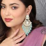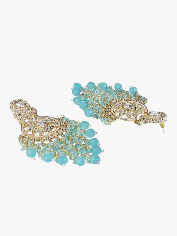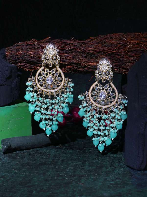 Gold-Plated Stone-Studed Pearl-Tessel Drop Earrings. Our Gold plating is long lasting and non allergic to skin,and has artificial stones,Secured with a fraction Back closure.