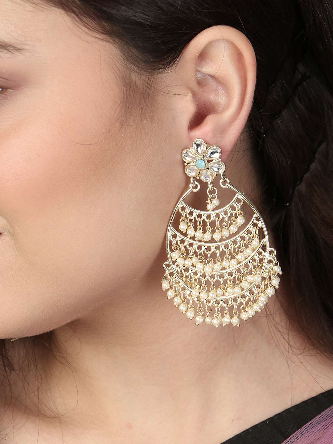 Gold-Plated Stone-Studed Pearl-Tessel Drop Earrings. Our Gold plating is long lasting and non allergic to skin,and has artificial stones,Secured with a fraction Back closure.