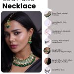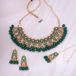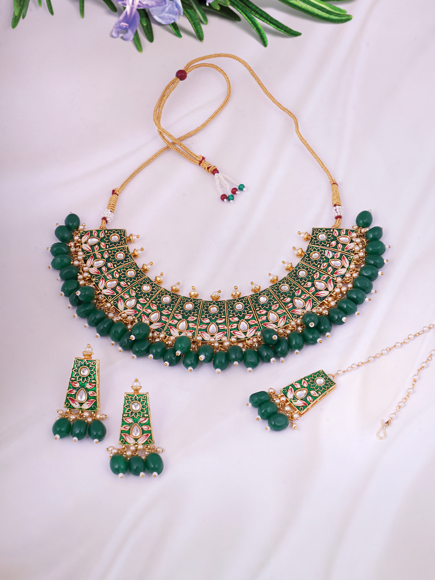 Women Gold Plated Traditional Green Meenakari Stone Studded Necklace and Earrings with Maangtikka, Secured with Drawstring , Push Back and S-hook respectively. The Green Beads Necklace is a beautifully crafted piece that captures the essence of traditional elegance. This Exquisite Minakari Green Beads Necklace with Red Leaf Pattern is designed for women who love intricate details and rich cultural artistry. The combination of Minakari jewellery techniques and a stunning red leaf pattern makes this necklace standout accessory for any occasion.