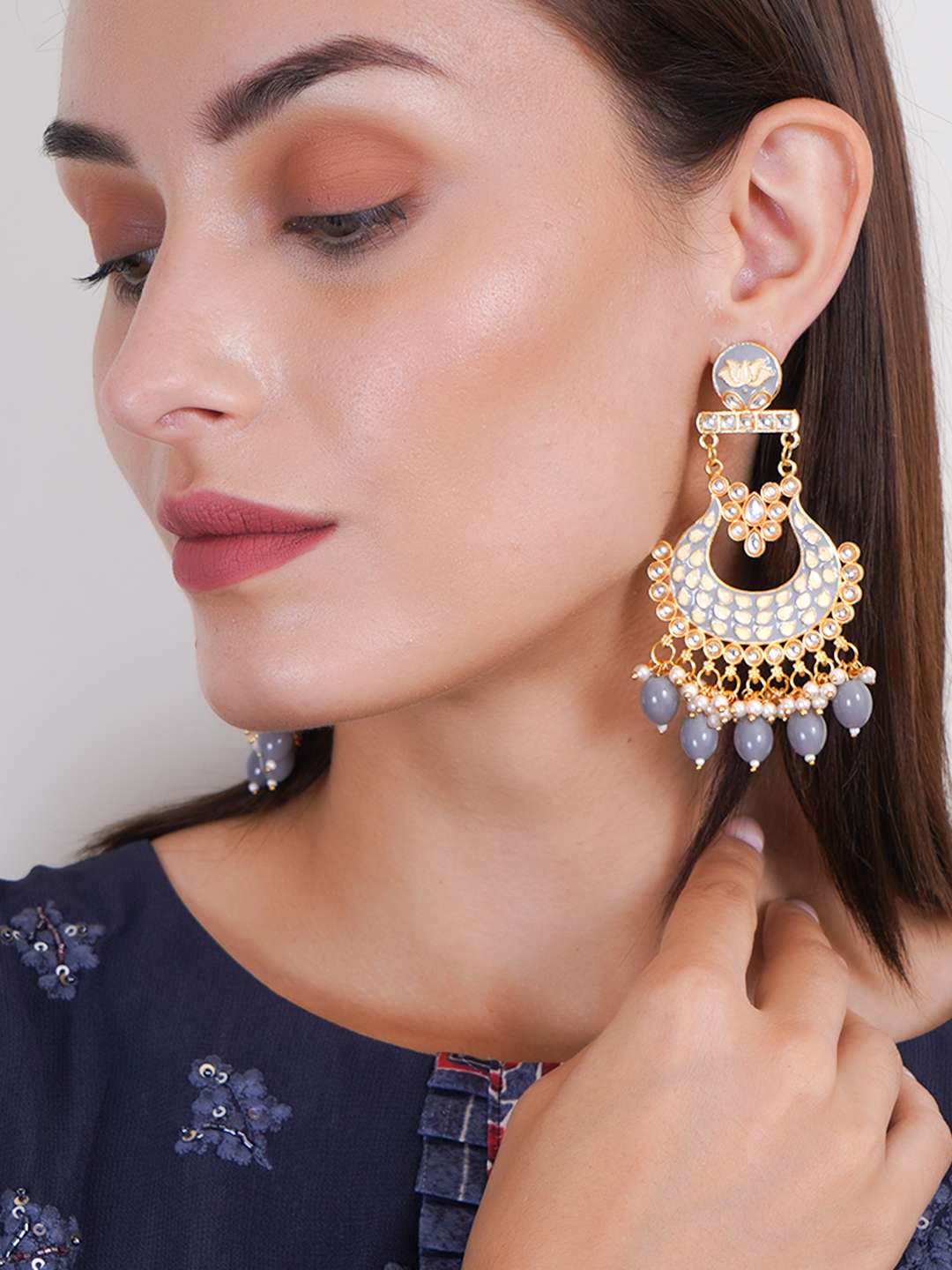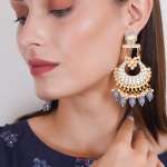 Women Gold Plated Kundan Studded and Pearl Tessels Lotus Dangler Earrings. Our Gold Plating is long lasting and non-allergic to skin. It Give you a beautiful elegant look with our outfit. We have lauching our new colorful color that matches with all your colorful outfits