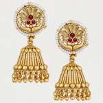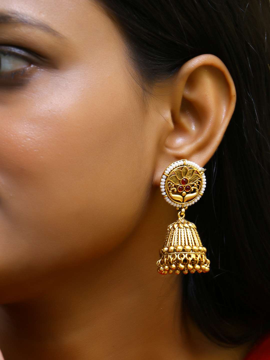 Women Gold Plated Red Stone Studded Floral Design Dome Jhumkas with Push Back Closure. Our Gold Plating is long lasting and non-allergic to skin. It Give you a beautiful elegant look with our outfit.