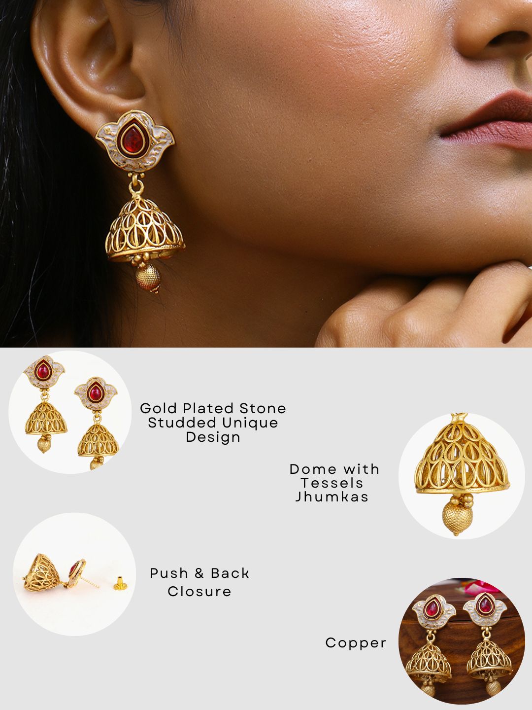 Women Gold Plated Red Stone Studded Unique Design Dome with Tessels Jhumkas with Push Back Closure. Our Gold Plating is long lasting and non-allergic to skin. It Give you a beautiful elegant look with our outfit.