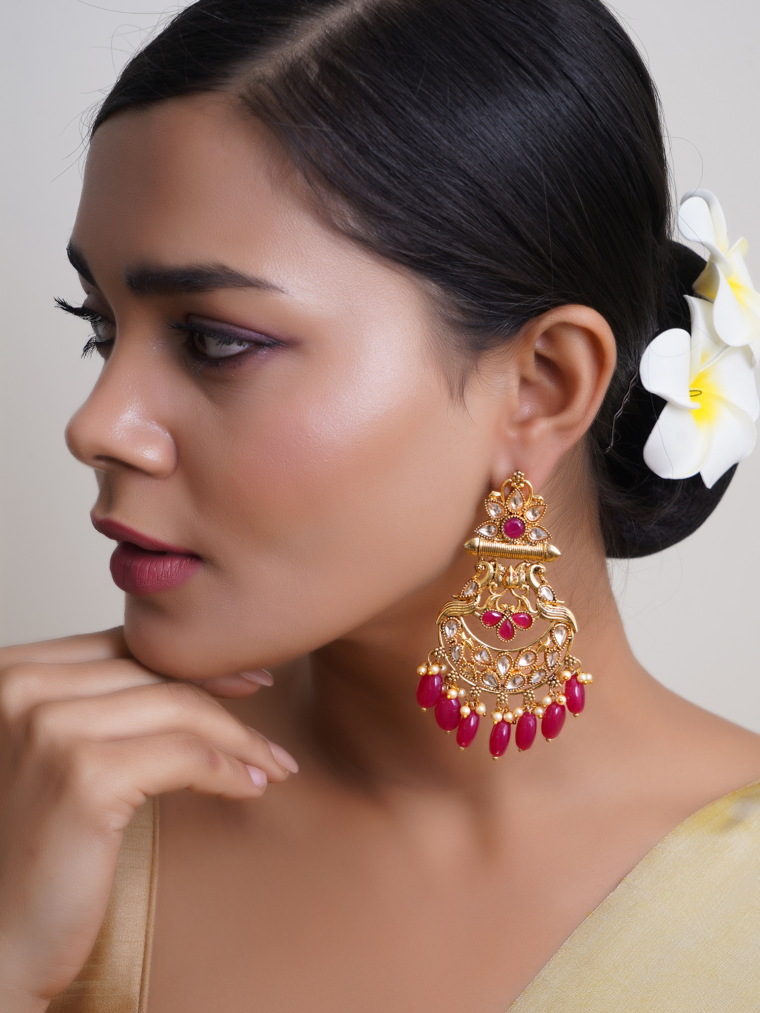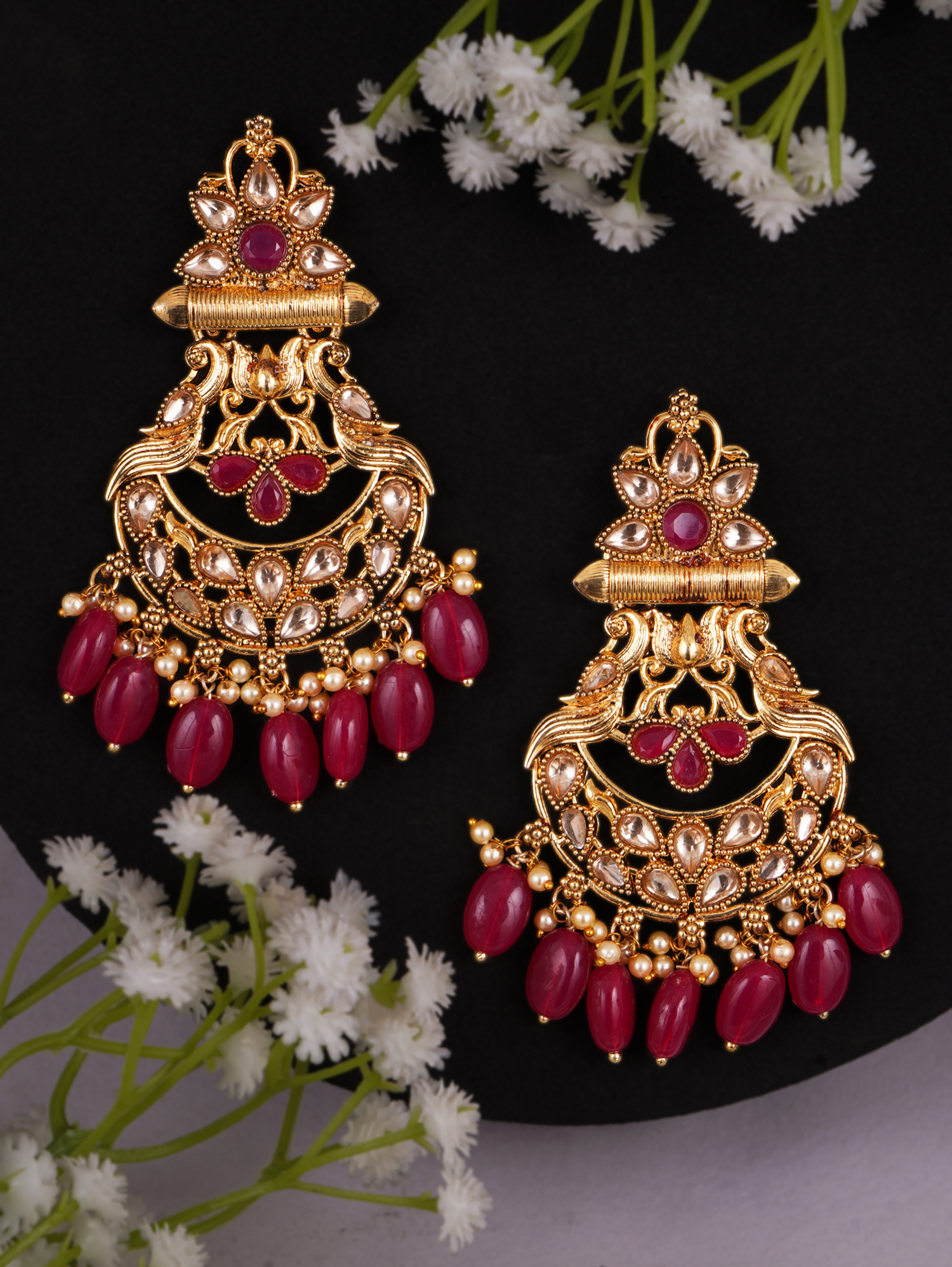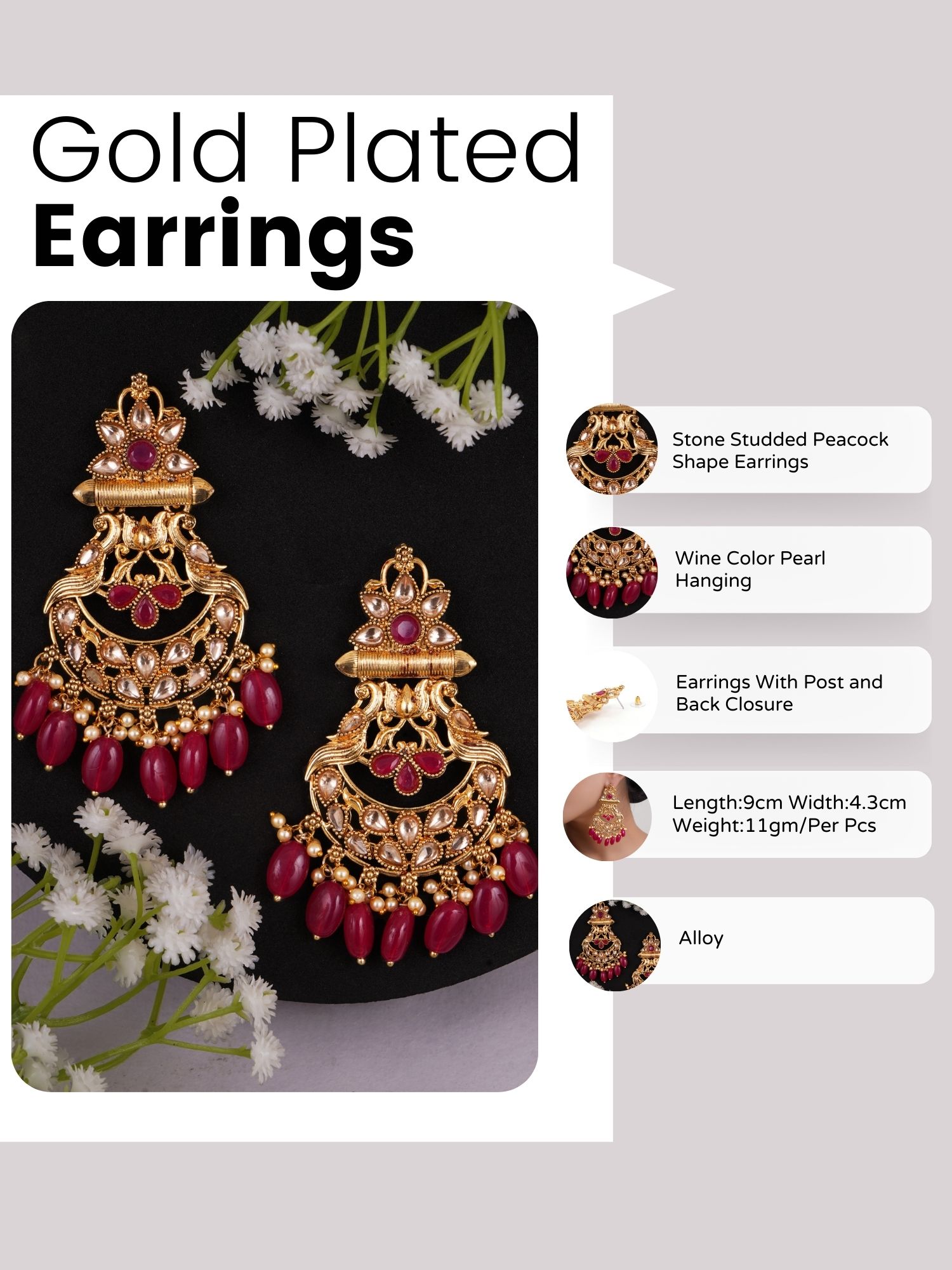 Gold Plated Wine Stone Studded Hanging Pearl Peacock Design Earrings are elegant accessories that blend classic charm with a touch of sparkle. Crafted with a gold-toned finish, these earrings feature intricately designed floral motifs, embellished with shimmering rhinestones for added brilliance. Perfect for elevating both everyday and special occasion outfits, these studs exude sophistication and timeless style.