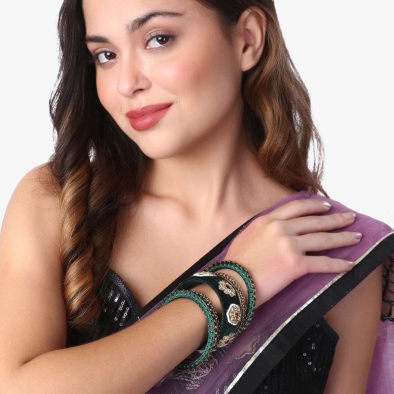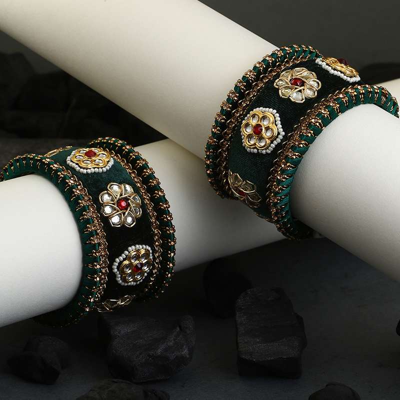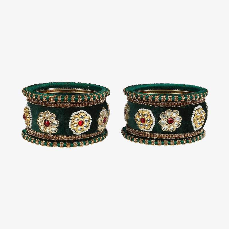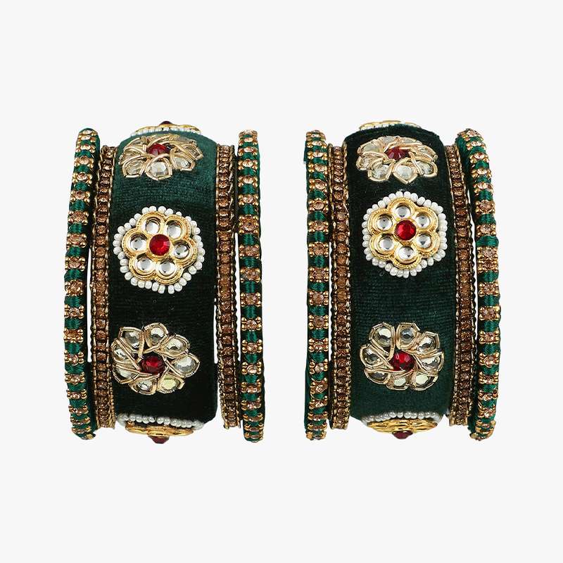 Women 24CT Set of 10 gold-plated Green Kundan Stone-Studded a Velvet Silk Thread Chuda Chura Bangle Set embellished chura chuda bangles with intricate textured detailing, has kundan studded, slip-on closure,our gold plating is long lasting and non allergic to skin.