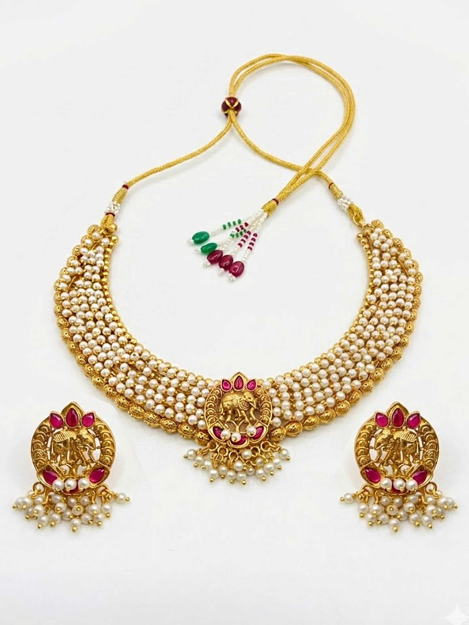 | Add a touch of elegance and tradition to your look with this Matte Gold Finish Pendant Pearl Chain Necklace Set, featuring a beautifully crafted elephant-design pendant. The matte gold plating paired with a delicate pearl chain creates a graceful and sophisticated aesthetic suitable for both festive and casual ethnic wear. The elephant motif symbolizes strength, wisdom, and good fortune, making this set not just a piece of jewelry but a meaningful accessory. Lightweight, stylish, and versatile, it is perfect for parties, celebrations, and cultural events, and also makes a thoughtful gift for loved ones. |