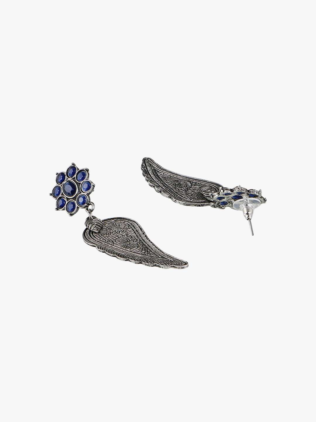 Oxidised Blue Stone-Studded Leaf-Temple Drop Earrings. Our Silver plating is long lasting and non allergic to skin,and has artificial stones,Secured with a fraction Back closure.