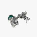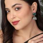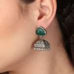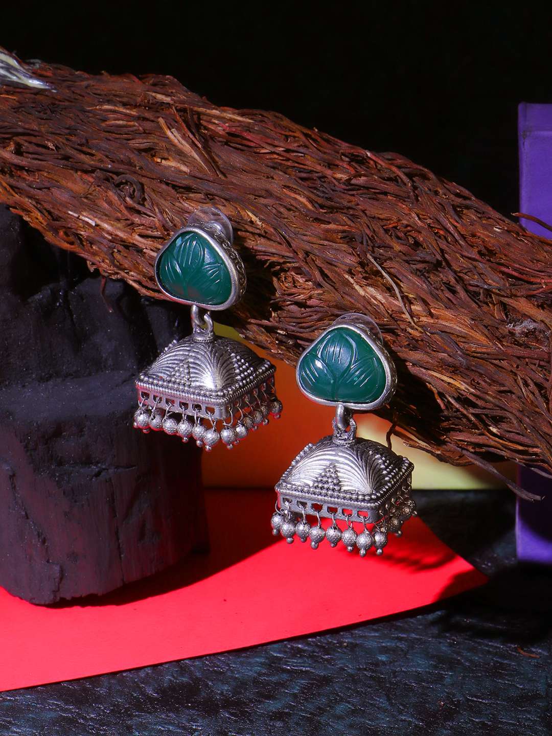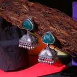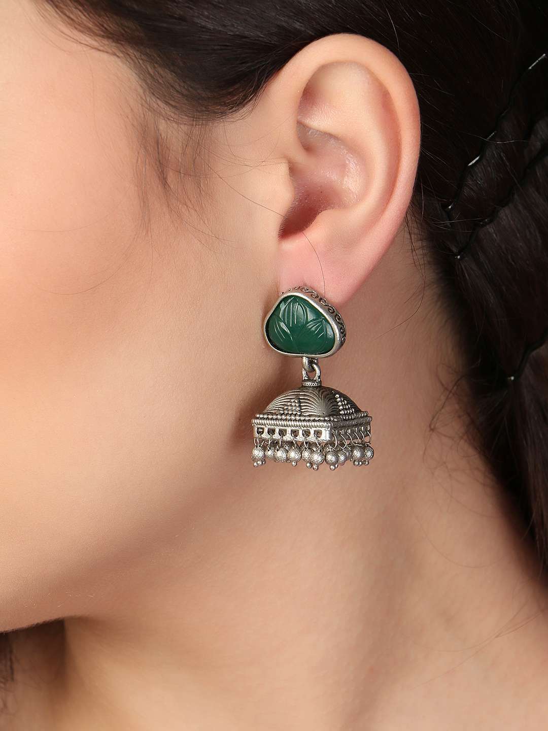 Oxidised Green Stone- Studded Pearl-Tessel Dome Shaped Jhumki. Our Silver plating is long lasting and non allergic to skin,and has artificial stones,Secured with a fraction Back closure.