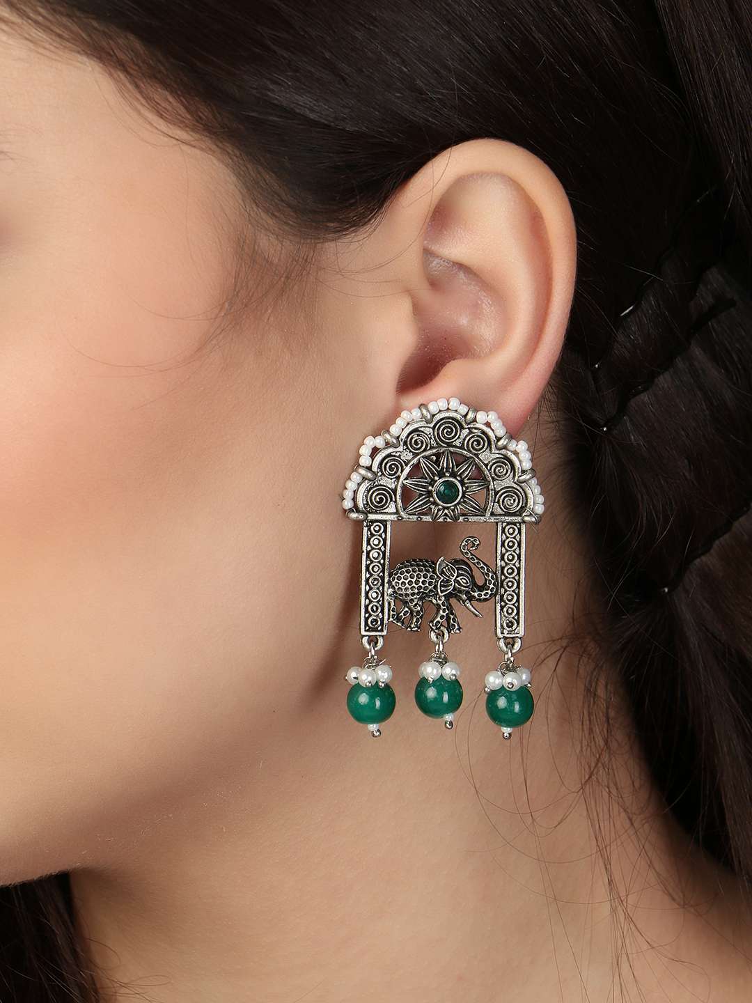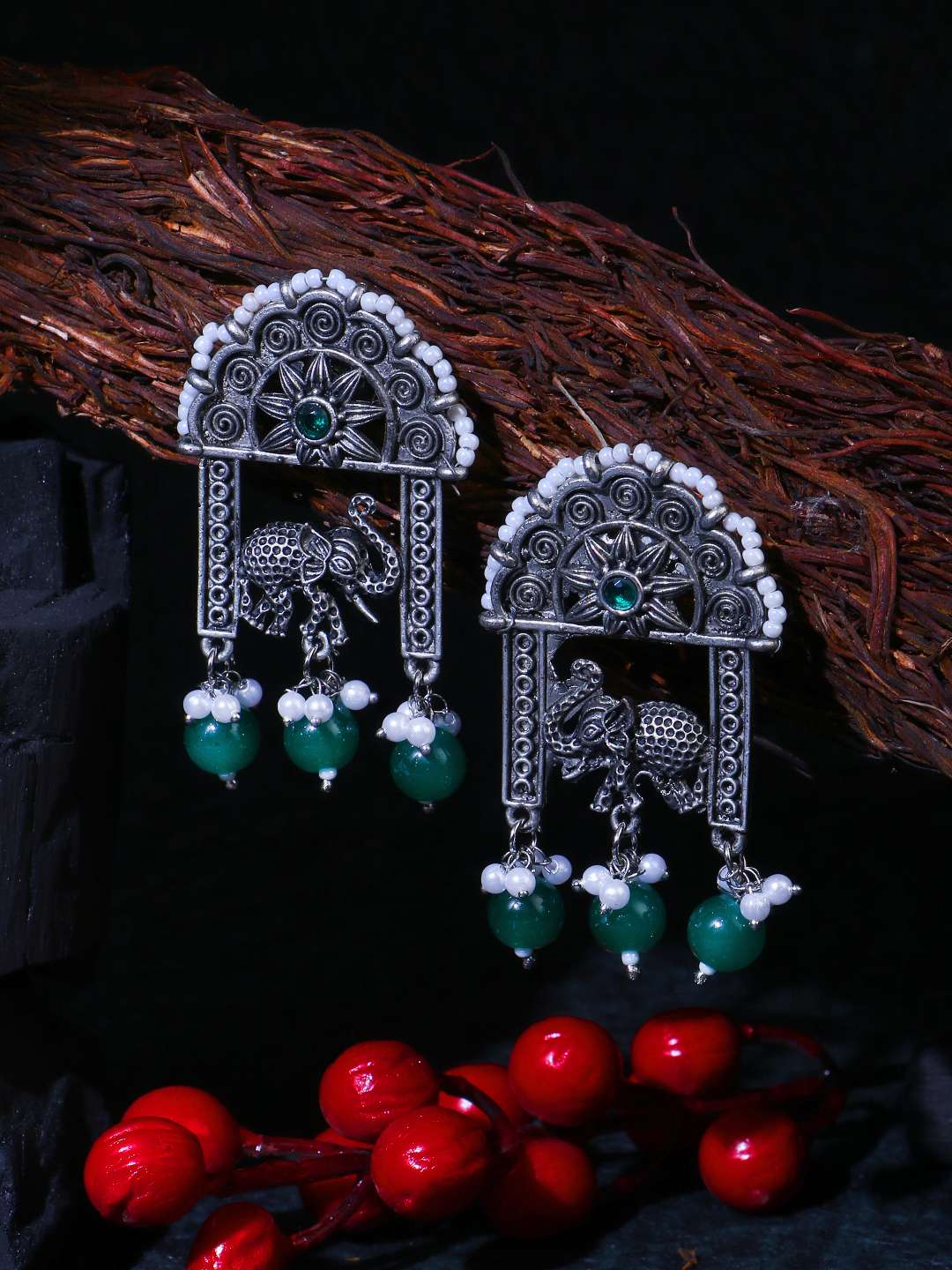 Oxidised Green Stone-Studded Pearl-Tessel Drop Earrings. Our Silver plating is long lasting and non allergic to skin,and has artificial stones,Secured with a fraction Back closure.