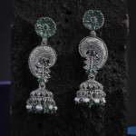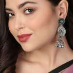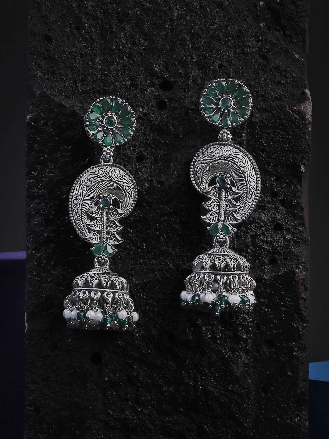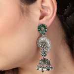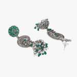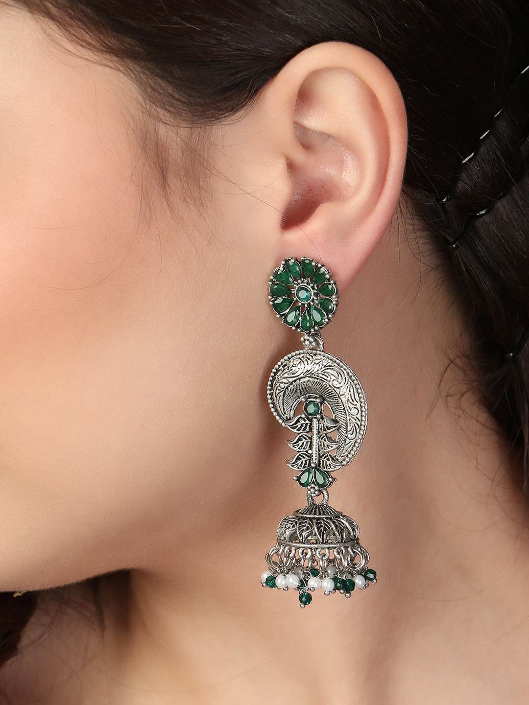Oxidised Green Stone-Studded Pearl-Tessel Drop Earrings. Our Silver plating is long lasting and non allergic to skin,and has artificial stones,Secured with a fraction Back closure.
