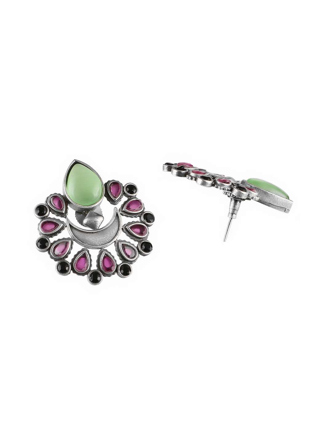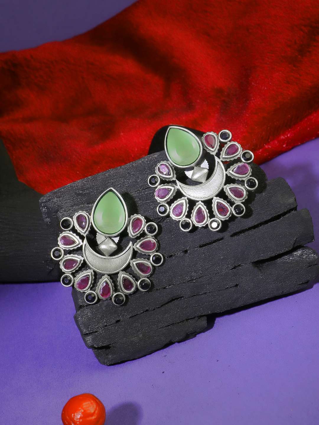 Oxidised Multi-Color Stone-Studded Studs. Our Silver plating is long lasting and non allergic to skin,and has artificial stones,Secured with a fraction Back closure.